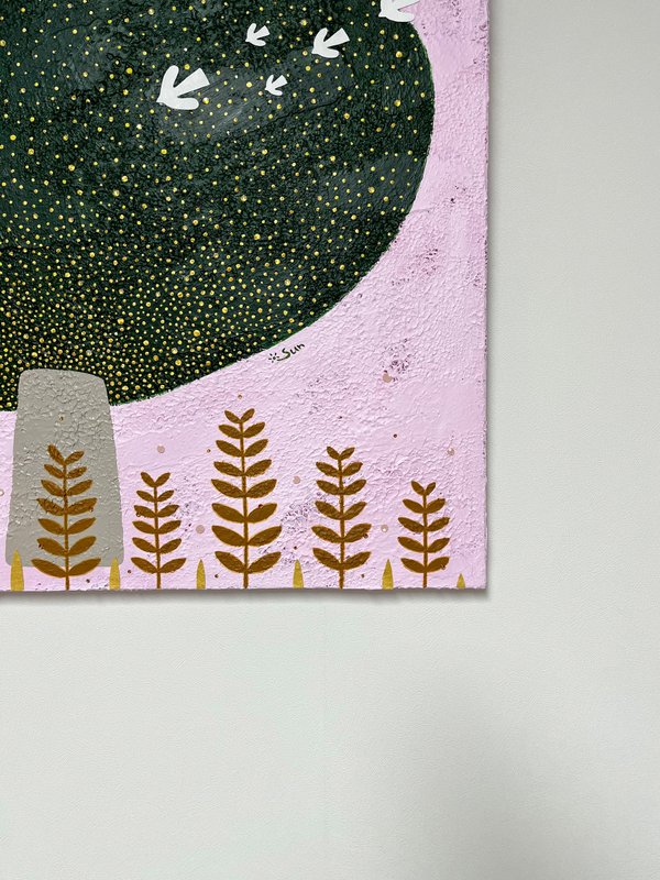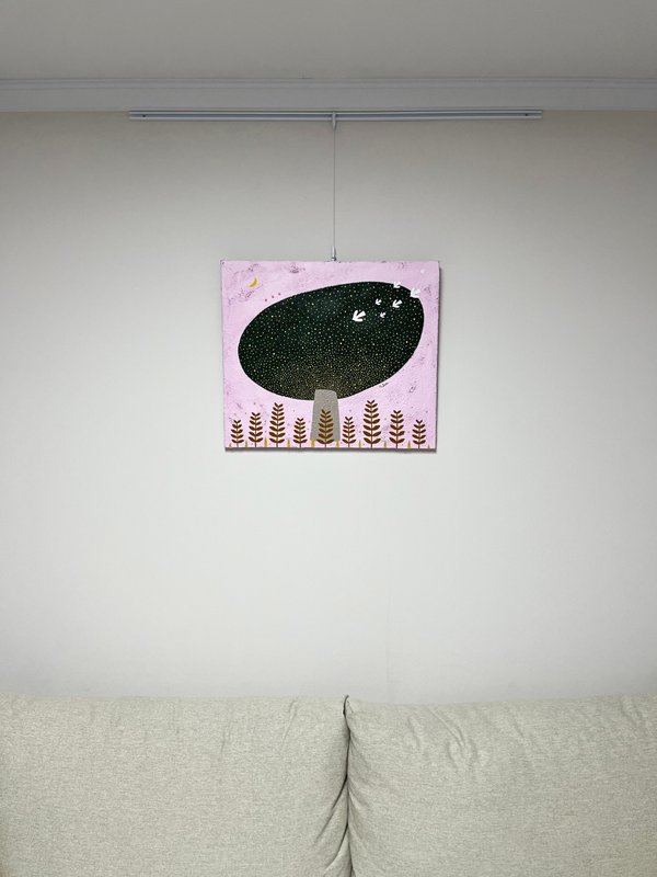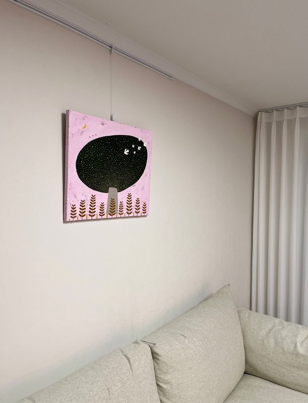 어린아이가 열심히 그린 그림 같은 느낌이 듭니다. 어린아이는 눈앞에 보여지는 겉모습에 집중하기 보다는 그 대상이 자신에게 주는 인상과 감정을 그대로 표현합니다. 작가는 화풍은 그때만의 특별한 감성을 떠올릴 수 있도록 해줍니다. 작가는 주로 노란색, 분홍색 같은 따듯하고 밝은 색을 사용해 행복함, 설렘 등의 감정을 표현합니다. 그림 속 나무들은 주변을 정화하는 힘이 있으며, 그 주변에서 사는 모든 것들 또한 그 축복을 받으니 세상은 행복함이 가득합니다. 작가의 작품은 감상자에게 기분 좋은 기운을 전달해줍니다. 유독 힘들었던 하루를 마치고 위로가 필요할 때면 그림을 바라보며 잠시 어린시절을 떠올려 보세요. 그림이 전달하는 따뜻한 격려와 위로를 느끼실 수 있습니다. 휴식과 안정을 취하는 공간에서 감상하시길 더욱 추천 드리고 싶은 작품입니다.