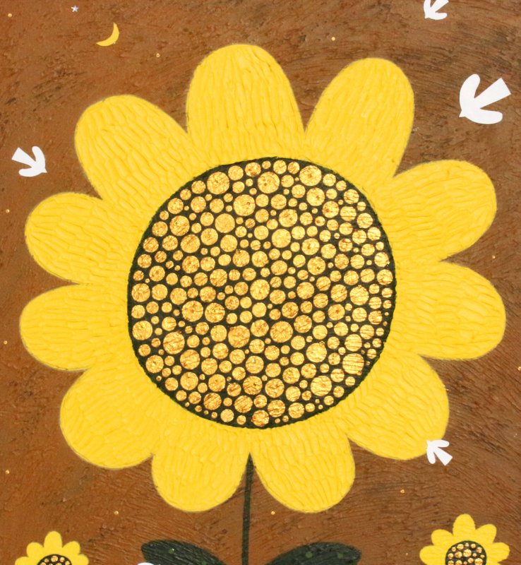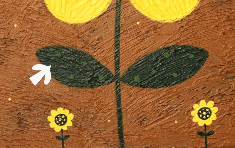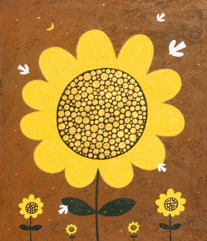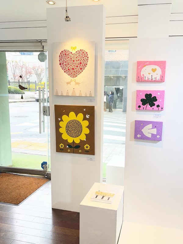 캔버스 안 가득 행복감과 동심이 느껴진다. 작가는 어린시절의 순수한 감성을 떠올리면서 느껴지는 세상을 표현한다. 아크릴로 그린 그림 위에 큐빅, 레이스, 패브릭 같은 작은 오브제들로 장식하면서 더욱 동화 같은 분위기를 연출한다. 어린아이가 느끼는 세상은 새롭고 신비로운 것들로 가득하다. 길가의 꽃, 나무, 하늘의 별, 날아가는 새 등 주변의 많은 것들로 하여금 매일매일 설렘을 느낄 수 있었다. 하지만 어른이 되어가며 그때의 감성은 서서히 흐릿해 진다. 그러나 작가는 우리가 언제든 그 때로 돌아갈 수 있다고 말한다. 시간은 빠르게 흘러가고 우리는 훌쩍 커버렸지만 어린시절 나를 설레게 했던 그것들은 여전히 곁에 남아있다. 잠시 어린시절을 회상해보며 그때의 감정을 느껴본다면 아름다운 이 세상에 계속 존재하고 있음에 감사함과 행복함을 느껴볼 수 있다.