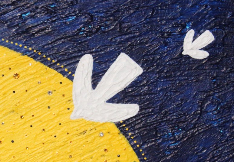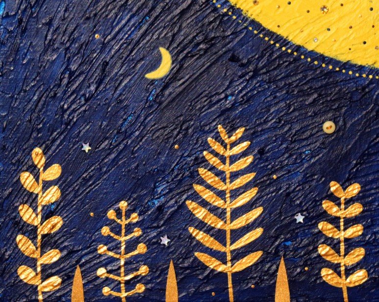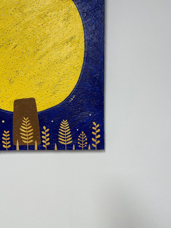 캔버스 안 가득 행복감과 동심이 느껴진다. 작가는 어린시절의 순수한 감성을 떠올리면서 느껴지는 세상을 표현한다. 아크릴로 그린 그림 위에 큐빅, 레이스, 패브릭 같은 작은 오브제들로 장식하면서 더욱 동화 같은 분위기를 연출한다. 어린아이가 느끼는 세상은 새롭고 신비로운 것들로 가득하다. 길가의 꽃, 나무, 하늘의 별, 날아가는 새 등 주변의 많은 것들로 하여금 매일매일 설렘을 느낄 수 있었다. 하지만 어른이 되어가며 그때의 감성은 서서히 흐릿해 진다. 그러나 작가는 우리가 언제든 그 때로 돌아갈 수 있다고 말한다. 시간은 빠르게 흘러가고 우리는 훌쩍 커버렸지만 어린시절 나를 설레게 했던 그것들은 여전히 곁에 남아있다. 잠시 어린시절을 회상해보며 그때의 감정을 느껴본다면 아름다운 이 세상에 계속 존재하고 있음에 감사함과 행복함을 느껴볼 수 있다.