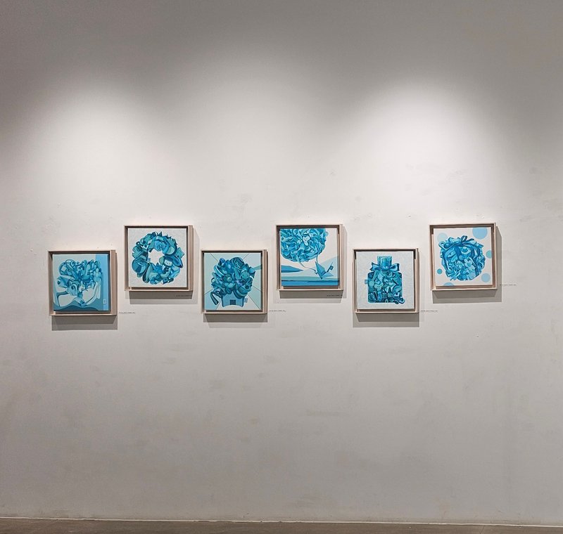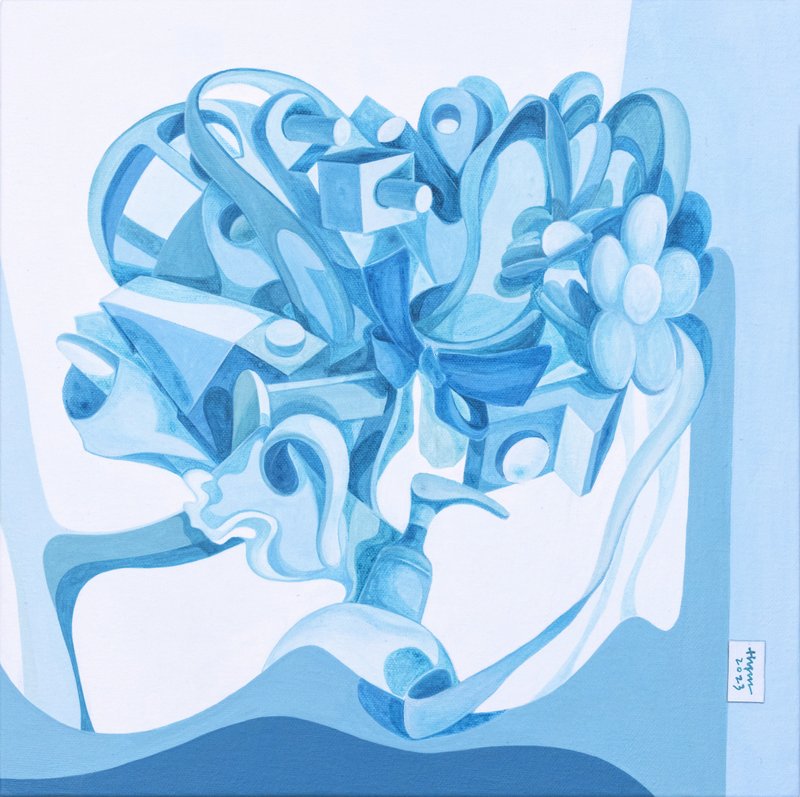 나현신 작가의 그림 속에서 귀여운 곰돌이 인형이나 피에로 탈, 레고 인형과 같은 장난감들은 모두 오래된 듯 푸른색으로 바래져 있습니다. 나현신 작가는 푸른색만을 사용하여 바랜 기억의 노스탤지어적 성격과 그리움의 감정을 동시에 담아냈습니다. 작가의 어린 시절과 행복했던 기억을 함께한 장난감들은 이제는 더 이상 없는, 과거의 것들이지만 이는 현재의 작가를 의미할 수 있습니다. 이렇게 흔히 발견할 수 있는 일상적인 사물들은 개인의 기억을 불러일으키곤 합니다. 행복했던 기억을 추억하고자 하는 마음과 어쩔 수 없이 마주하게 되는 그리움이라는 감정들이 모여 나현신 작가의 몽환적인 그림을 완성합니다. 화면에 감도는 푸른 빛은 작품을 감상하는 관람자에게 조용히 말을 걸어와 행복했던 시절, 그 순간들을 상기시켜 주며 미소 짓게 해줄 것입니다.