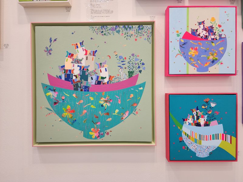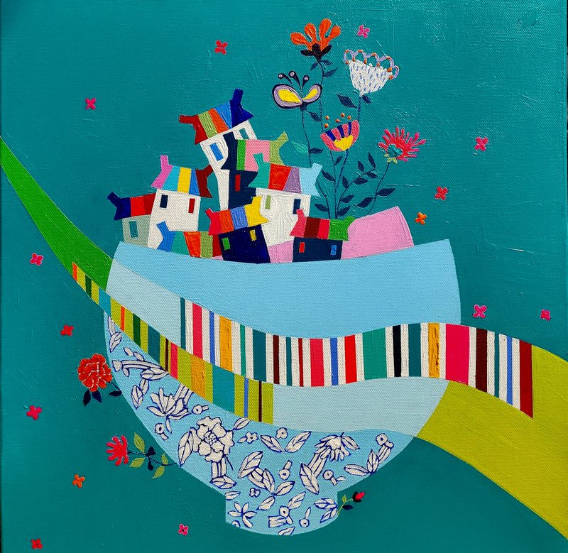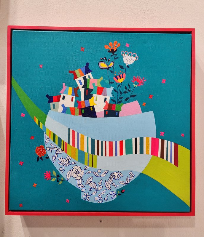 오현주 작가의 그림에서 눈에 띄는 재료는 금뿐만이 아닙니다. 반복해서 등장하는 소재인 집은 작가의 캔버스에서 재료가 됩니다. 각각의 집들은 알록달록하게 칠해져 각자의 특성을 띠고 있지만, 이를 가장 조화롭게 담아내는 것은 이들을 한데 연결해 주고 있는 금색 띠입니다. 이렇게 쌓아 올려진 집들이나 서로 밀접하게 붙은 집들은 함께 동거하며 하나의 랜드를 구성하고, 하나 되는 공동체 모습의 조화로움은 작가에게 이데아로 표현되고 있습니다. 집이 모여 하나의 구성체가 되고, 아름다운 풍경을 구축하는 것이 오현주 작가의 화면 속 중심이자 대표적 가치이며, 그가 궁극적으로 표현하고자 하는 심미적 아름다움입니다. 작가의 작품을 감상하고 있으면, 내 집은 어디쯤에서 이웃들과 연결되어 공동체를 이루고 있을까 생각하게 됩니다.