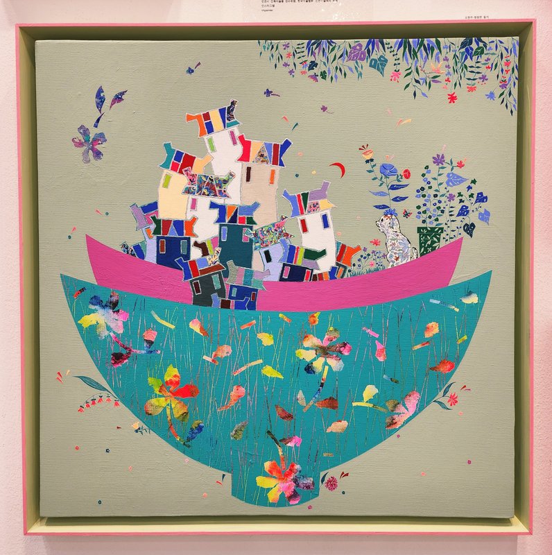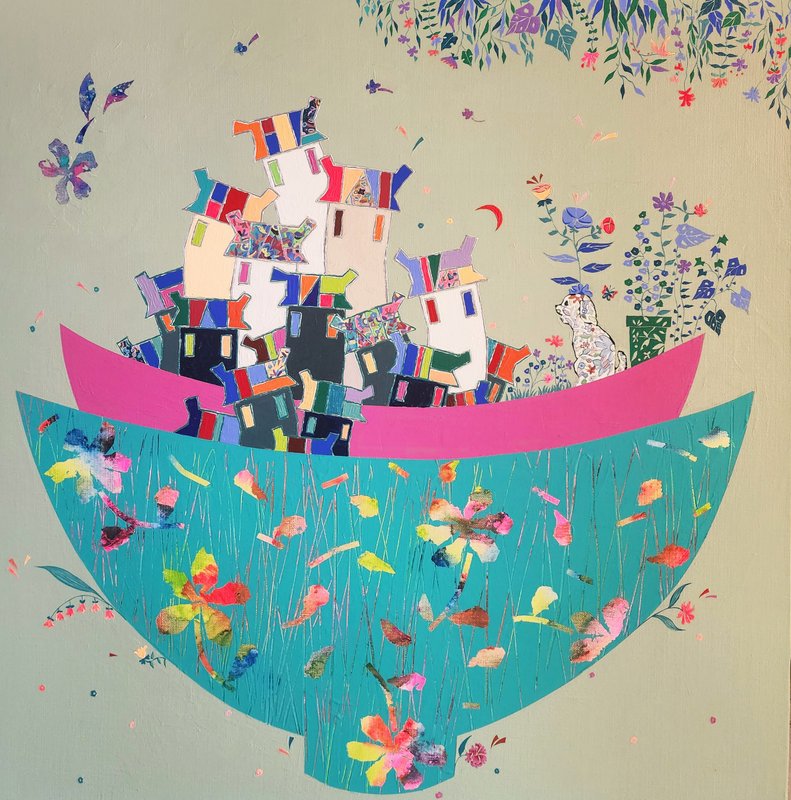 오현주 작가의 그림에서 눈에 띄는 재료는 금뿐만이 아닙니다. 반복해서 등장하는 소재인 집은 작가의 캔버스에서 재료가 됩니다. 각각의 집들은 알록달록하게 칠해져 각자의 특성을 띠고 있지만, 이를 가장 조화롭게 담아내는 것은 이들을 한데 연결해 주고 있는 금색 띠입니다. 이렇게 쌓아 올려진 집들이나 서로 밀접하게 붙은 집들은 함께 동거하며 하나의 랜드를 구성하고, 하나 되는 공동체 모습의 조화로움은 작가에게 이데아로 표현되고 있습니다. 집이 모여 하나의 구성체가 되고, 아름다운 풍경을 구축하는 것이 오현주 작가의 화면 속 중심이자 대표적 가치이며, 그가 궁극적으로 표현하고자 하는 심미적 아름다움입니다. 작가의 작품을 감상하고 있으면, 내 집은 어디쯤에서 이웃들과 연결되어 공동체를 이루고 있을까 생각하게 됩니다.