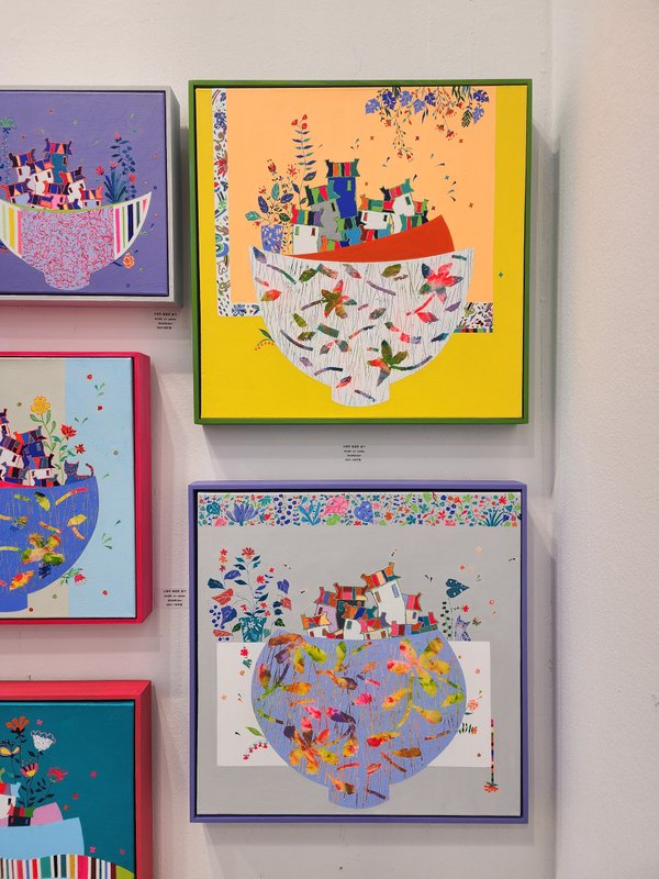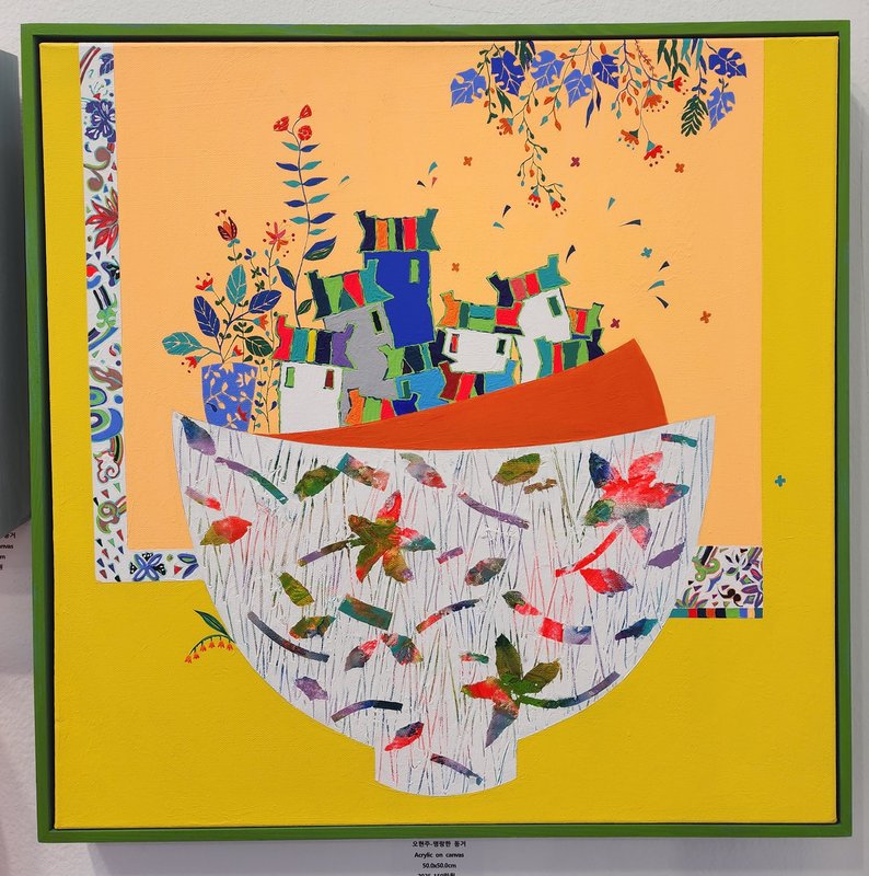 오현주 작가의 그림에서 눈에 띄는 재료는 금뿐만이 아닙니다. 반복해서 등장하는 소재인 집은 작가의 캔버스에서 재료가 됩니다. 각각의 집들은 알록달록하게 칠해져 각자의 특성을 띠고 있지만, 이를 가장 조화롭게 담아내는 것은 이들을 한데 연결해 주고 있는 금색 띠입니다. 이렇게 쌓아 올려진 집들이나 서로 밀접하게 붙은 집들은 함께 동거하며 하나의 랜드를 구성하고, 하나 되는 공동체 모습의 조화로움은 작가에게 이데아로 표현되고 있습니다. 집이 모여 하나의 구성체가 되고, 아름다운 풍경을 구축하는 것이 오현주 작가의 화면 속 중심이자 대표적 가치이며, 그가 궁극적으로 표현하고자 하는 심미적 아름다움입니다. 작가의 작품을 감상하고 있으면, 내 집은 어디쯤에서 이웃들과 연결되어 공동체를 이루고 있을까 생각하게 됩니다.