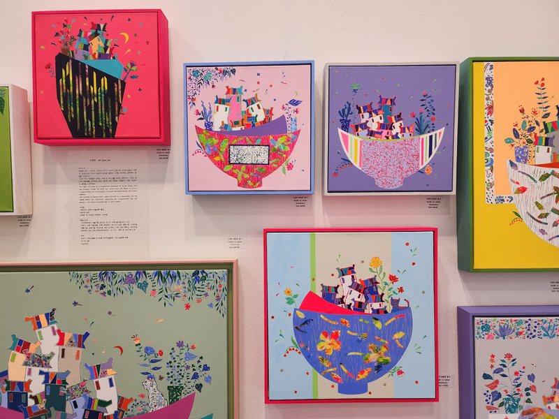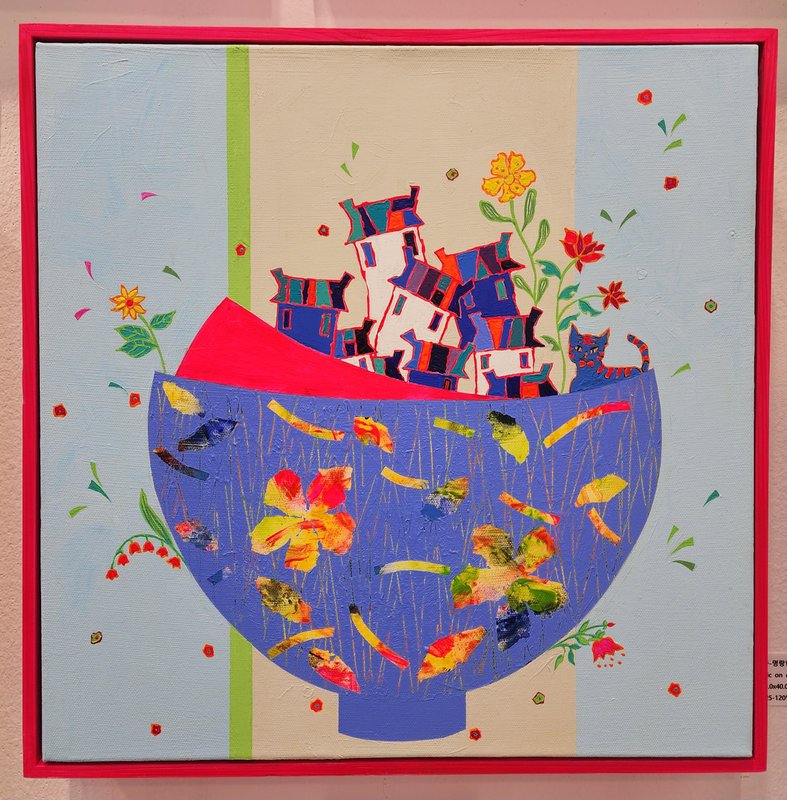 오현주 작가의 그림에서 눈에 띄는 재료는 금뿐만이 아닙니다. 반복해서 등장하는 소재인 집은 작가의 캔버스에서 재료가 됩니다. 각각의 집들은 알록달록하게 칠해져 각자의 특성을 띠고 있지만, 이를 가장 조화롭게 담아내는 것은 이들을 한데 연결해 주고 있는 금색 띠입니다. 이렇게 쌓아 올려진 집들이나 서로 밀접하게 붙은 집들은 함께 동거하며 하나의 랜드를 구성하고, 하나 되는 공동체 모습의 조화로움은 작가에게 이데아로 표현되고 있습니다. 집이 모여 하나의 구성체가 되고, 아름다운 풍경을 구축하는 것이 오현주 작가의 화면 속 중심이자 대표적 가치이며, 그가 궁극적으로 표현하고자 하는 심미적 아름다움입니다. 작가의 작품을 감상하고 있으면, 내 집은 어디쯤에서 이웃들과 연결되어 공동체를 이루고 있을까 생각하게 됩니다.