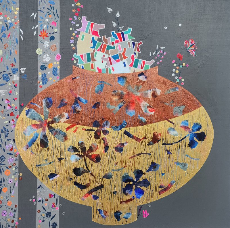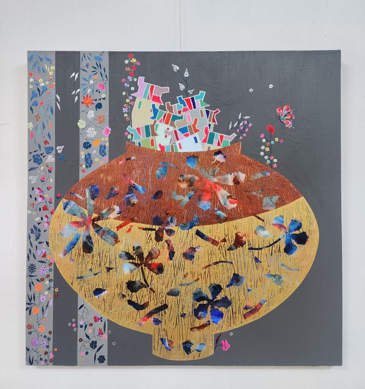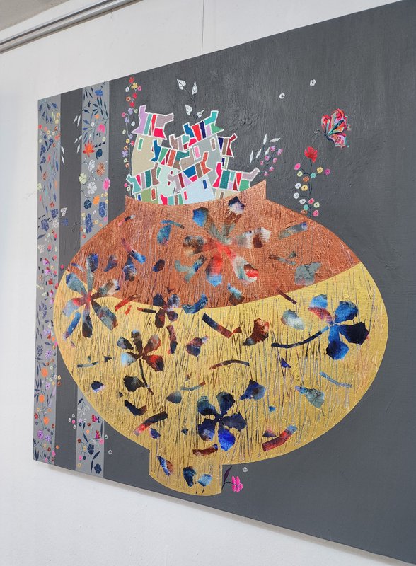 오현주 작가의 그림에서 눈에 띄는 재료는 금뿐만이 아닙니다. 반복해서 등장하는 소재인 집은 작가의 캔버스에서 재료가 됩니다. 각각의 집들은 알록달록하게 칠해져 각자의 특성을 띠고 있지만, 이를 가장 조화롭게 담아내는 것은 이들을 한데 연결해 주고 있는 금색 띠입니다. 이렇게 쌓아 올려진 집들이나 서로 밀접하게 붙은 집들은 함께 동거하며 하나의 랜드를 구성하고, 하나 되는 공동체 모습의 조화로움은 작가에게 이데아로 표현되고 있습니다. 집이 모여 하나의 구성체가 되고, 아름다운 풍경을 구축하는 것이 오현주 작가의 화면 속 중심이자 대표적 가치이며, 그가 궁극적으로 표현하고자 하는 심미적 아름다움입니다. 작가의 작품을 감상하고 있으면, 내 집은 어디쯤에서 이웃들과 연결되어 공동체를 이루고 있을까 생각하게 됩니다.