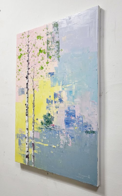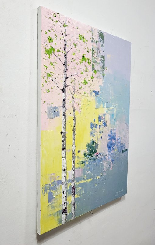 신재흥 작가 작품의 특징은 붓이 아닌 나이프의 간결하고 군더더기 없는 터치를 활용해 섬세한 표현을 만들어낸다는 점입니다. 가까이에서 보았을 때는 둔해 보이는 터치가 한 발짝 떨어져 바라보면 놀라울 만큼 섬세한 묘사로 드러납니다. 이러한 표현은 작품에 독특한 질감을 더하고, 구상적인 풍경에 추상적인 결을 불어넣습니다. 툭툭 찍어낸 듯한 거친 터치에도 불구하고 편안하고 따뜻한 심상을 자극하는 것은 질감과는 상반되는 부드럽고 따뜻한 파스텔톤 색감이 주로 사용된 탓입니다. 환상적인 색감, 수직과 수평적 요소가 도드라지는 작품의 구성 등은 자칫 흔하게 느껴질 수 있는 풍경에 작가만의 특색을 불어넣어 감상하는 재미를 더합니다. 풍경화는 익숙한 이미지기에 오히려 더 마음이 편안해지고 위로받게 되는지도 모르겠습니다. 다양한 추억과 심상을 자극하는 아름다운 풍경을 통해 휴식과 따뜻한 위로를 얻어가시기를 바랍니다.