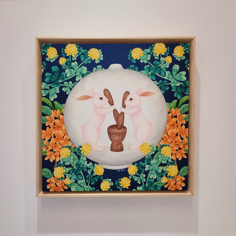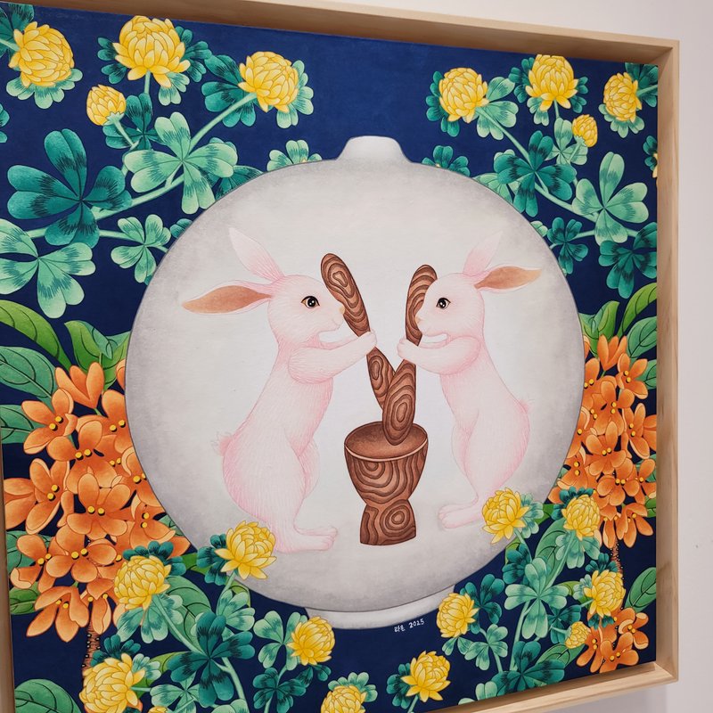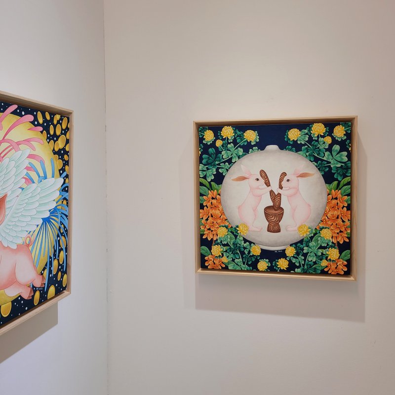 백은경 작가의 화면에서는 강렬한 색채에 경계선이 뚜렷한 격자무늬 패턴이나 또렷한 눈매를 가진 해태와 기린이 등장하여 관람자의 마음을 사로잡습니다. 작가는 전통 채색화를 현대적으로 재해석하여 자신만의 화풍을 만들고 현대인들의 소망을 담아내는 작업을 이어가고 있습니다. 작가는 반복적인 패턴으로 화면에 안정감을 구축하고 동시에 현대적 감각을 가미하였습니다. 우리나라 전통 오색 빛에서 착안한 듯한 색감을 사용하여 따뜻한 느낌을 주고 동시에 전통 채색화의 특성을 살렸습니다. 현대적 감각이 돋보이는 백은경 작가의 작품은 장식 미술에서 널리 사용되는 패턴을 순수 미술에 접합하였기에 더욱 유쾌하게 감상하실 수 있습니다.