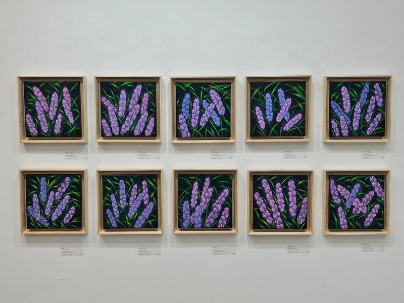 작가에게 작업이란 내면의 불안감을 해소하고 신체적 결함을 극복하는 일련의 수행과도 같습니다. 작업의 주된 키워드는 ’반복 과몰입‘으로, 작업에 몰입하는 순간 무아지경의 상태에 빠지게 되고 곧 무수한 선들로 가득 찬 알 수 없는 세계가 등장합니다. 이 세계는 타인과는 다르게 세상을 바라볼 수밖에 없는 작가 자신을 나타낼 것입니다. 시각의 불안정함은 자신이 바라보는 세상을 똑바로 해석할 수 없기에 심리적인 위태로움을 느끼게 할 것입니다. 하지만 작가는 이를 극복하여 작품으로 승화시켰으며 이러한 행위는 예술이란 결함조차도 특별함으로 바꿀 수 있는 영역임을 보여줍니다. 따라서 결과물뿐 아니라 그 안에 담긴 과정 자체에 높은 가치가 부여되는 작품입니다. 그림이 갖는 차분하고 신비로운 분위기는 명상 또는 업무와 같이 고요한 집중력을 요구하는 공간과 더욱 잘 어우러질 것으로 생각됩니다.