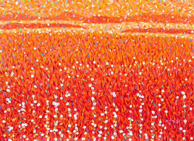 성기혁 작가의 작품 속에는 꽃잎이 가득하다. 점묘화인 듯 이리저리 붓 자국과 점으로 이루어진 듯한 작품 속 풍경을 통해 감상자는 색채로 화면이 이루어진다는 것을 알게 된다. 조화롭게 어우러지는 색채의 점들은 조화롭게 화면을 메우고 물체들은 각각의 형태를 띤다. 나무가 우거진 숲, 저 멀리 산등성이가 보이는 풍경, 꽃이 흐드러지게 핀 나무의 모습은 작가가 직시한 풍경을 재현한 것이겠지만, 작가는 이를 색채로 각각의 형태를 갖추게 묘사하며 하나의 상상화를 완성한 것이다. 현실에서는 마주할 수 없는 풍경이지만, 관람자는 거리를 두고 성기혁 작가의 화면을 보며 자연 풍경을 떠올리게 된다. 색채만으로 풍경을 묘사하고 관람자의 상상을 자극하는 것은 성기혁 작가의 특기이다. 그 때문에 꽃으로 화면을 가득 채운 작가의 그림에서 관람자는 익숙한 풍경을 찾는다.