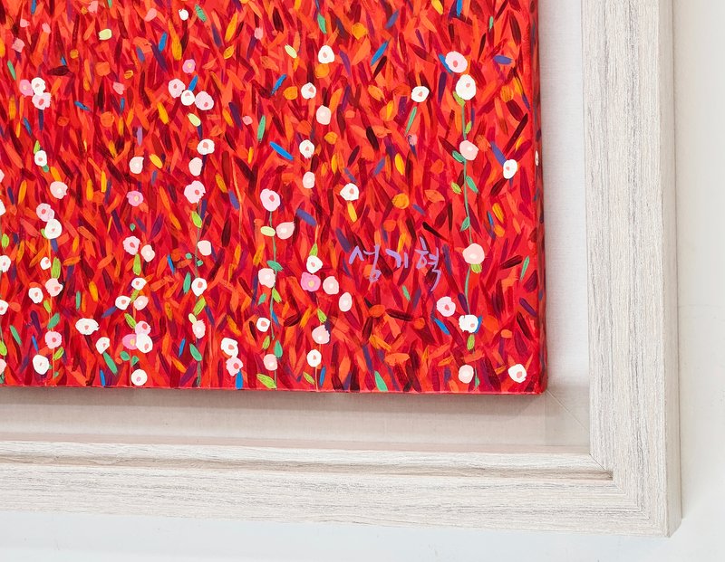 작품을 감상할 때, 가까이서 보는 것과 멀리서 보는 것의 차이를 아는 것은 중요합니다. 성기혁 작가의 작품에 가까이 다가가 유심히 살펴보면 한 송이 한 송이 활짝 핀 꽃을 볼 수 있습니다. 하지만, 한 걸음 물러나서 전체 화면 감상하면 화면을 가득 메운 꽃잎이 하나의 풍경을 이루고 있음을 알 수 있습니다. 이러한 효과만 보며 성기혁 작가의 작품을 섣불리 점묘화로 칭할 수는 없습니다. 작가는 다양한 색채를 활용하여 나무나 산의 형태가 두드러지게 표현하고 이를 통해 궁극적으로는 하나의 풍경을 묘사하기 때문입니다. 그림의 구석구석을 유심히 살피다 보면 붓 자국 하나하나, 꽃잎 하나하나의 특색을 찾아볼 수 있습니다. 가까이서, 또 멀리서 성기혁 작가의 작품을 감상하며 자연의 모습을 즐겨보시길 추천해 드립니다.
