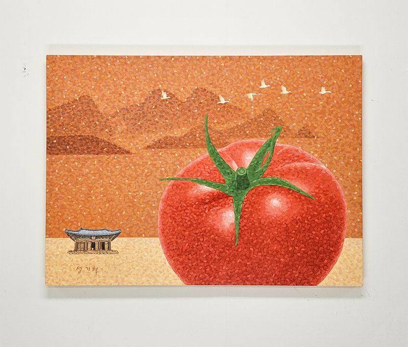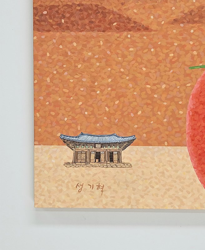 성기혁 작가의 작품 속에는 꽃잎이 가득하다. 점묘화인 듯 이리저리 붓 자국과 점으로 이루어진 듯한 작품 속 풍경을 통해 감상자는 색채로 화면이 이루어진다는 것을 알게 된다. 조화롭게 어우러지는 색채의 점들은 조화롭게 화면을 메우고 물체들은 각각의 형태를 띤다. 나무가 우거진 숲, 저 멀리 산등성이가 보이는 풍경, 꽃이 흐드러지게 핀 나무의 모습은 작가가 직시한 풍경을 재현한 것이겠지만, 작가는 이를 색채로 각각의 형태를 갖추게 묘사하며 하나의 상상화를 완성한 것이다. 현실에서는 마주할 수 없는 풍경이지만, 관람자는 거리를 두고 성기혁 작가의 화면을 보며 자연 풍경을 떠올리게 된다. 색채만으로 풍경을 묘사하고 관람자의 상상을 자극하는 것은 성기혁 작가의 특기이다. 그 때문에 꽃으로 화면을 가득 채운 작가의 그림에서 관람자는 익숙한 풍경을 찾는다.