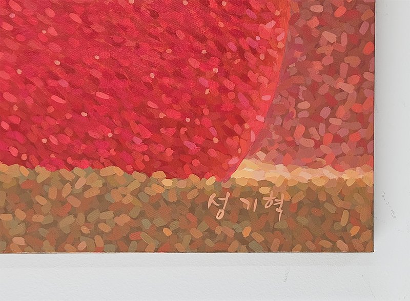 작품을 감상할 때, 가까이서 보는 것과 멀리서 보는 것의 차이를 아는 것은 중요합니다. 성기혁 작가의 작품에 가까이 다가가 유심히 살펴보면 한 송이 한 송이 활짝 핀 꽃을 볼 수 있습니다. 하지만, 한 걸음 물러나서 전체 화면 감상하면 화면을 가득 메운 꽃잎이 하나의 풍경을 이루고 있음을 알 수 있습니다. 이러한 효과만 보며 성기혁 작가의 작품을 섣불리 점묘화로 칭할 수는 없습니다. 작가는 다양한 색채를 활용하여 나무나 산의 형태가 두드러지게 표현하고 이를 통해 궁극적으로는 하나의 풍경을 묘사하기 때문입니다. 그림의 구석구석을 유심히 살피다 보면 붓 자국 하나하나, 꽃잎 하나하나의 특색을 찾아볼 수 있습니다. 가까이서, 또 멀리서 성기혁 작가의 작품을 감상하며 자연의 모습을 즐겨보시길 추천해 드립니다.