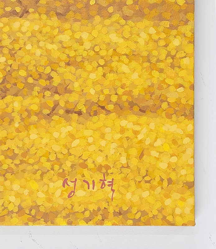 작품을 감상할 때, 가까이서 보는 것과 멀리서 보는 것의 차이를 아는 것은 중요합니다. 성기혁 작가의 작품에 가까이 다가가 유심히 살펴보면 한 송이 한 송이 활짝 핀 꽃을 볼 수 있습니다. 하지만, 한 걸음 물러나서 전체 화면 감상하면 화면을 가득 메운 꽃잎이 하나의 풍경을 이루고 있음을 알 수 있습니다. 이러한 효과만 보며 성기혁 작가의 작품을 섣불리 점묘화로 칭할 수는 없습니다. 작가는 다양한 색채를 활용하여 나무나 산의 형태가 두드러지게 표현하고 이를 통해 궁극적으로는 하나의 풍경을 묘사하기 때문입니다. 그림의 구석구석을 유심히 살피다 보면 붓 자국 하나하나, 꽃잎 하나하나의 특색을 찾아볼 수 있습니다. 가까이서, 또 멀리서 성기혁 작가의 작품을 감상하며 자연의 모습을 즐겨보시길 추천해 드립니다.