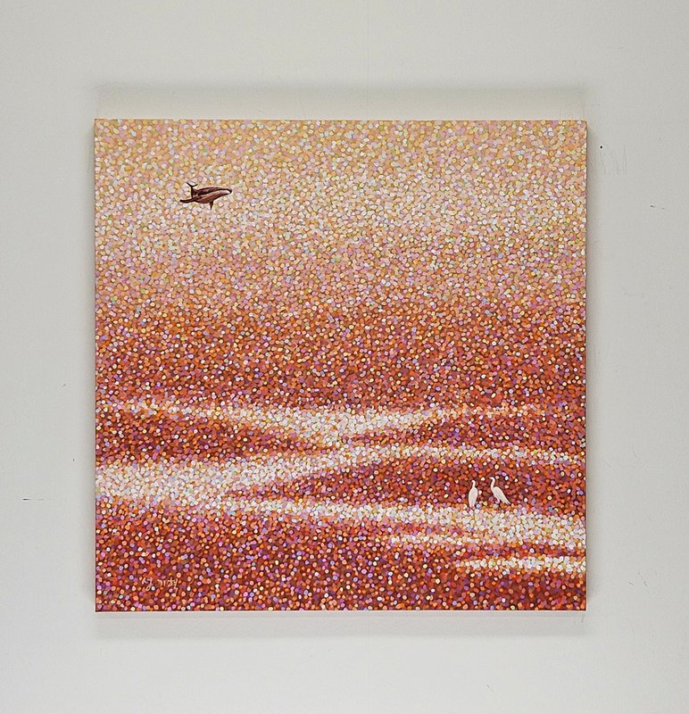 성기혁 작가의 작품 속에는 꽃잎이 가득하다. 점묘화인 듯 이리저리 붓 자국과 점으로 이루어진 듯한 작품 속 풍경을 통해 감상자는 색채로 화면이 이루어진다는 것을 알게 된다. 조화롭게 어우러지는 색채의 점들은 조화롭게 화면을 메우고 물체들은 각각의 형태를 띤다. 나무가 우거진 숲, 저 멀리 산등성이가 보이는 풍경, 꽃이 흐드러지게 핀 나무의 모습은 작가가 직시한 풍경을 재현한 것이겠지만, 작가는 이를 색채로 각각의 형태를 갖추게 묘사하며 하나의 상상화를 완성한 것이다. 현실에서는 마주할 수 없는 풍경이지만, 관람자는 거리를 두고 성기혁 작가의 화면을 보며 자연 풍경을 떠올리게 된다. 색채만으로 풍경을 묘사하고 관람자의 상상을 자극하는 것은 성기혁 작가의 특기이다. 그 때문에 꽃으로 화면을 가득 채운 작가의 그림에서 관람자는 익숙한 풍경을 찾는다.