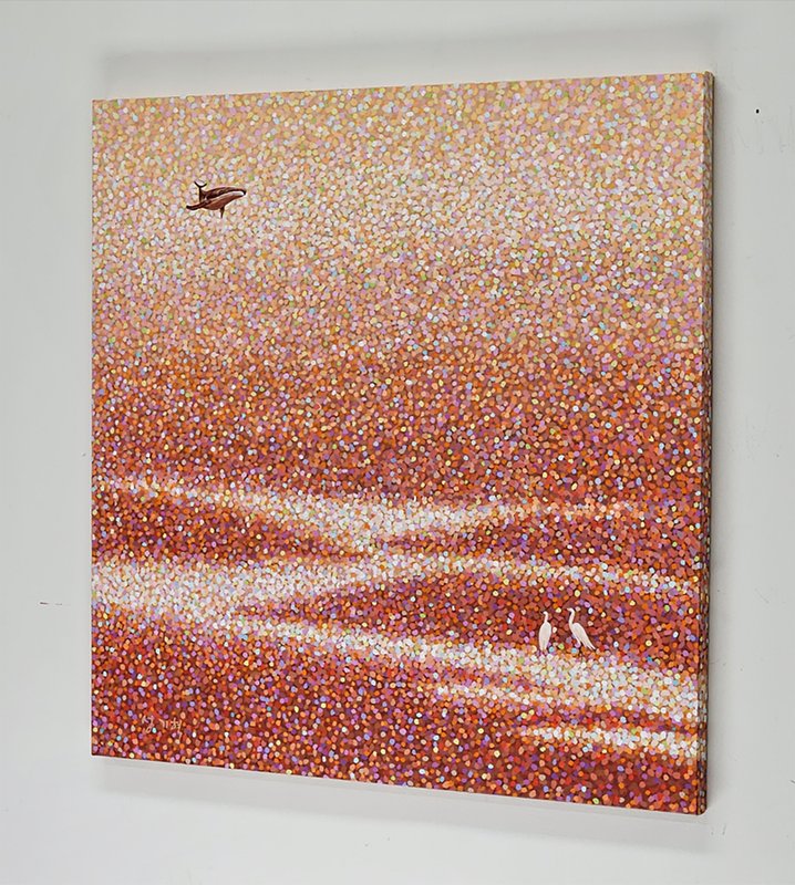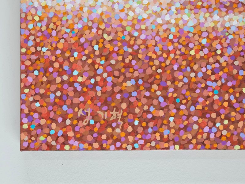 작품을 감상할 때, 가까이서 보는 것과 멀리서 보는 것의 차이를 아는 것은 중요합니다. 성기혁 작가의 작품에 가까이 다가가 유심히 살펴보면 한 송이 한 송이 활짝 핀 꽃을 볼 수 있습니다. 하지만, 한 걸음 물러나서 전체 화면 감상하면 화면을 가득 메운 꽃잎이 하나의 풍경을 이루고 있음을 알 수 있습니다. 이러한 효과만 보며 성기혁 작가의 작품을 섣불리 점묘화로 칭할 수는 없습니다. 작가는 다양한 색채를 활용하여 나무나 산의 형태가 두드러지게 표현하고 이를 통해 궁극적으로는 하나의 풍경을 묘사하기 때문입니다. 그림의 구석구석을 유심히 살피다 보면 붓 자국 하나하나, 꽃잎 하나하나의 특색을 찾아볼 수 있습니다. 가까이서, 또 멀리서 성기혁 작가의 작품을 감상하며 자연의 모습을 즐겨보시길 추천해 드립니다.