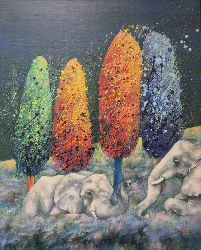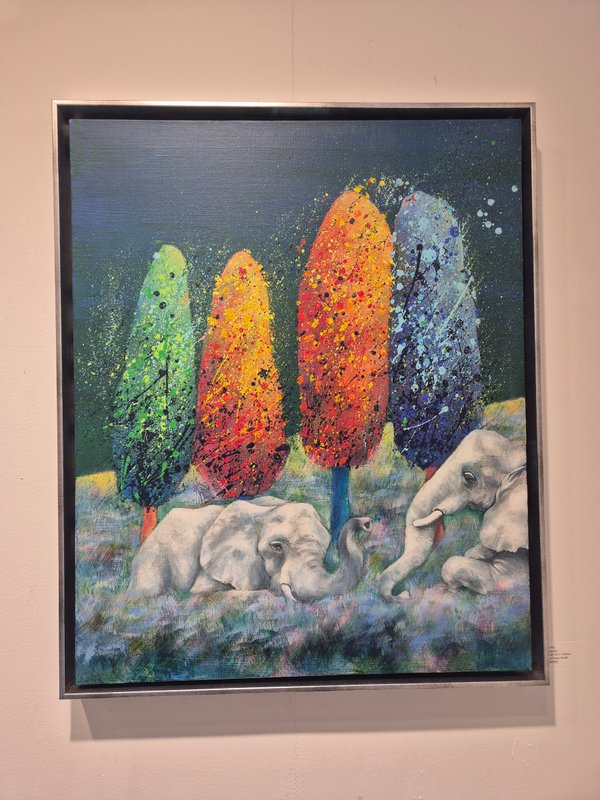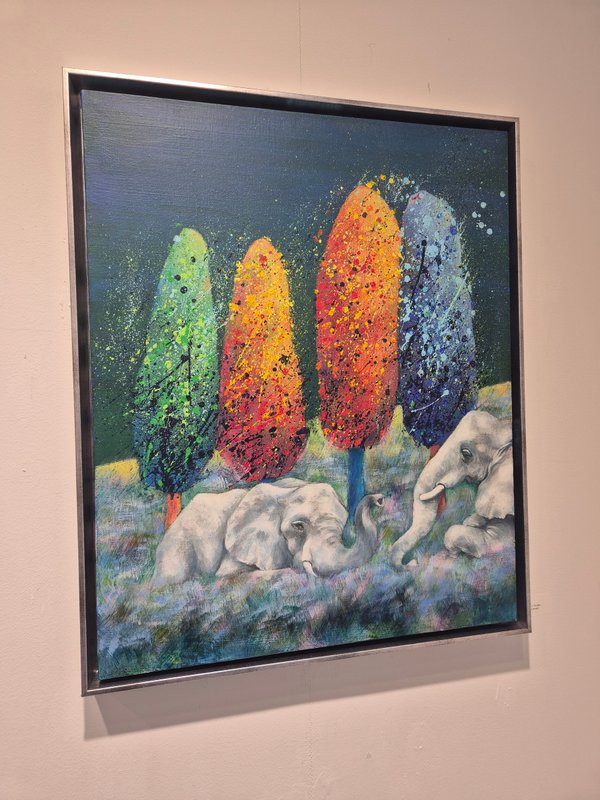 코끼리는 높은 지능을 가졌으며 사회성 또한 높습니다. 이러한 특징은 인간과 비슷하기에 코끼리는 우리에게 친근한 동물로 여겨져 왔습니다. 작가가 코끼리를 작품의 주 소재로 선택한 이유는 자연과 인간 사이의 교집합에 속해 있기 때문일 것입니다. 작품 속 코끼리는 자연과 인간을 이어주는 다리의 역할을 수행하고 있습니다. 작가는 다양한 구성과 색감의 변화를 통해 코끼리의 강함 또는 선함을 자유롭게 표현했습니다. 따라서 작품에 따라 강렬하고 선명한 공간 또는 부드러운 분위기의 공간을 연출해 보실 수 있습니다. 코끼리의 선한 기운은 감상자에게 힘을 건네주며 공간 가득 자연의 신비로운 에너지를 채워줄 것입니다.
