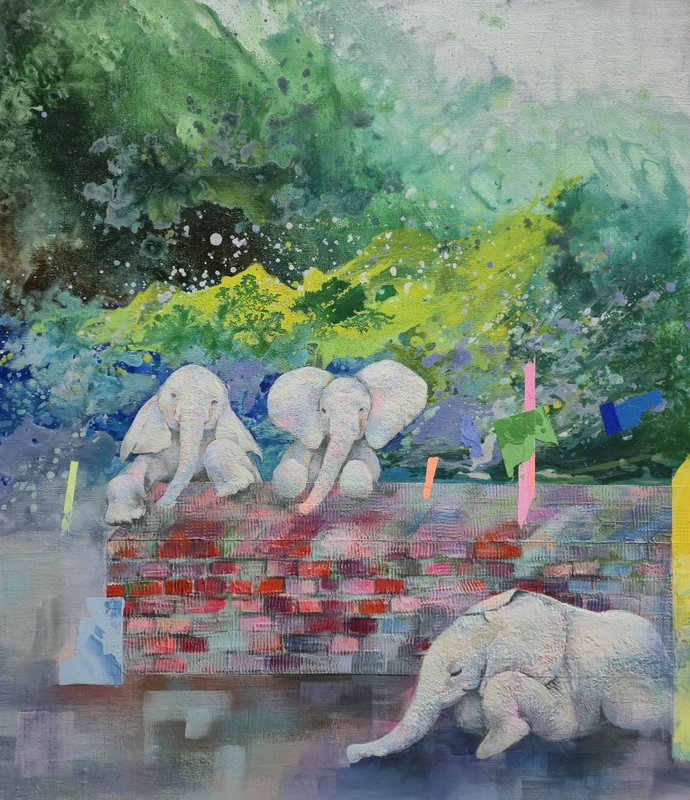 심미선 작가는 자연과 코끼리 그리고 인간의 교감을 주제로 다양한 반 구상 형태의 작업을 진행한다. 코끼리는 따뜻하고 정겨운 이미지를 가진 동물로 인간의 정서와 닮았다. 또한 코끼리의 범접할 수 없는 강함은 그 자체로 자연을 상징하기도 한다. 작품 속 코끼리가 서로의 감정을 전달하고 교감하는 장면은 자연과 인간의 상호작용을 표현한다. 나이프로 표현된 캔버스의 표면은 다소 거친 느낌이 있다. 하지만 이와는 대조적으로 밝은 색감을 사용하여 동화적이고 신비로운 분위기를 연출했다. 이러한 요소들은 커다란 몸집의 투박함 속에 선한 눈빛을 가진 코끼리의 특징을 잘 담아냈다. 자연과 인간은 동행하며 각자의 흐름대로 살아간다. 이들의 교감이 만들어내는 긍정적인 에너지가 작품 속에 담겨있다.