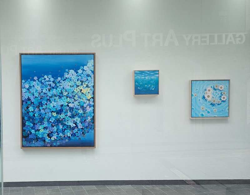 신윤영 작가의 꽃 연작은 크고 작은 꽃들이 마치 물속을 유영하는 듯한 장면을 담아낸 신작이다. 작가는 캔버스에 아크릴로 화려한 푸른 빛 배경을 연출하고, 무리 지어 있는 꽃들을 하나하나 세밀하게 그려 넣는다. 작가에 따르면, 사람들은 모두 인생의 여러 변곡점을 지나 점진적으로 나아가며 성장한다. 작가는 이러한 우리네 삶을 각각의 꽃송이에 투영하였다. 이때 물의 압력을 극복하고 물살에 흔들리며 빛나는 수면을 향해 전진하는 꽃 무리의 모습은, 현 위치에서 더 넓은 세상으로 나아가고자 하는 우리의 인생 여정과 도전을 상징한다. 피고 지는 꽃으로 인생을 은유한 신윤영 작가의 작품은, 감상자들이 인생이라는 거친 물결 속에서도 아름다운 꽃망울을 피워내길 염원하는 듯 따스하다.