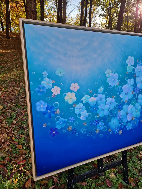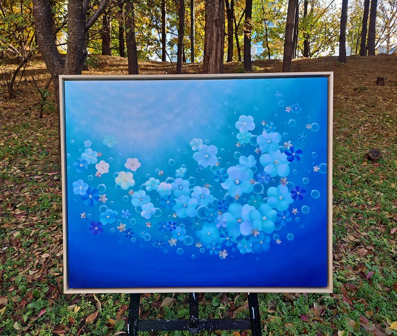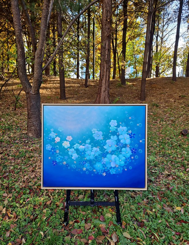 신윤영 작가의 꽃 연작은 크고 작은 꽃들이 마치 물속을 유영하는 듯한 장면을 담아낸 신작이다. 작가는 캔버스에 아크릴로 화려한 푸른 빛 배경을 연출하고, 무리 지어 있는 꽃들을 하나하나 세밀하게 그려 넣는다. 작가에 따르면, 사람들은 모두 인생의 여러 변곡점을 지나 점진적으로 나아가며 성장한다. 작가는 이러한 우리네 삶을 각각의 꽃송이에 투영하였다. 이때 물의 압력을 극복하고 물살에 흔들리며 빛나는 수면을 향해 전진하는 꽃 무리의 모습은, 현 위치에서 더 넓은 세상으로 나아가고자 하는 우리의 인생 여정과 도전을 상징한다. 피고 지는 꽃으로 인생을 은유한 신윤영 작가의 작품은, 감상자들이 인생이라는 거친 물결 속에서도 아름다운 꽃망울을 피워내길 염원하는 듯 따스하다.