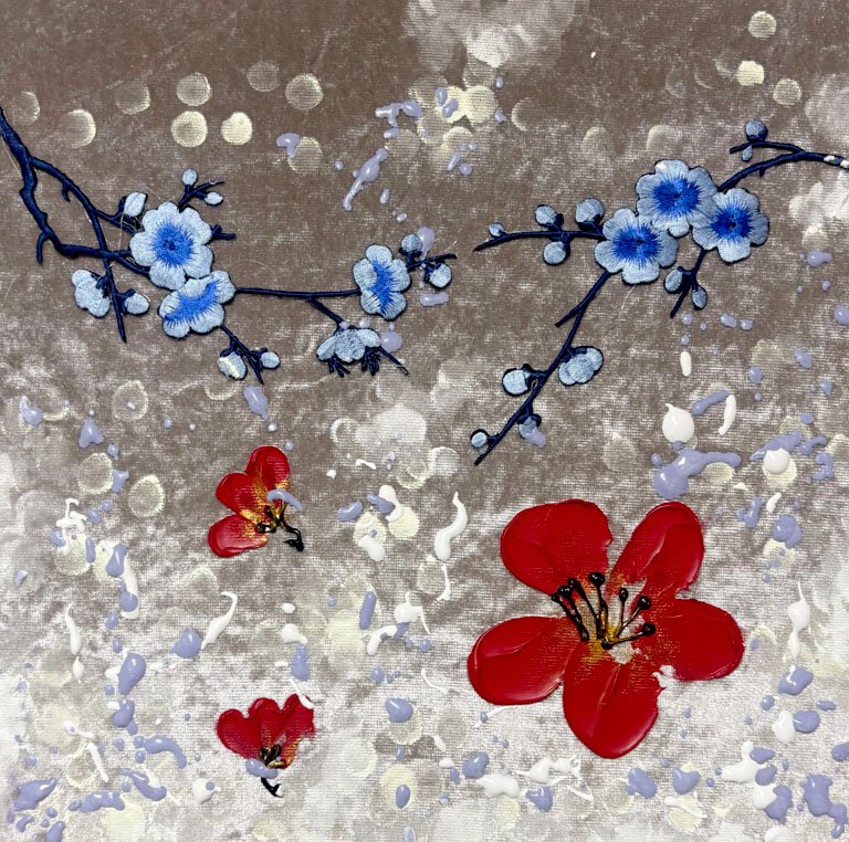 작업의 주요 소재는 어사화이다. 어사화(御賜花)는 왕이 하사한 꽃이라는 의미가 있다. 이 꽃은 관직에 오른 신하에게 하사하는 선물로 성공과 출세를 상징한다. 꽃은 저마다 다른 뜻이 있기 때문에 축하, 애도, 기념 등 다양한 상황에 쓰인다. 꽃은 지속력이 아주 짧다는 특징을 갖는다. 꺾는 순간부터 생명은 빠르게 저물어 간다. 작가는 짧은 수명을 가진 꽃들의 향연을 오래도록 함께 하고 싶은 바람을 담아 그림을 그린다. ‘지속성’에 초점을 맞추었기 때문에, 종이나 한지와 같이 상대적으로 훼손되기 쉬운 재료 대신 나무패널과 벨벳을 작품의 주재료로 선택했다. 벨벳은 흡수력이 좋고 짜임이 단단하여 오랜 시간 퇴색되지 않는다는 장점이 있다. 또한 벨벳 특유의 부드러움은 작품을 더욱 고급스럽게 만들어준다. 어사화라는 동양적 소재가 서양화 재료들과 만나 감상자로 하여금 더욱 호기심을 불러일으킨다.
