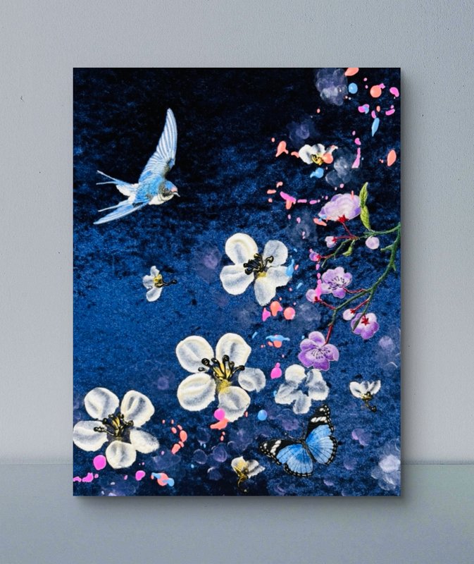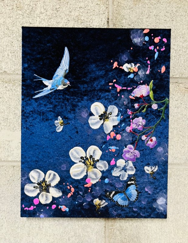 작업의 주요 소재는 어사화이다. 어사화(御賜花)는 왕이 하사한 꽃이라는 의미가 있다. 이 꽃은 관직에 오른 신하에게 하사하는 선물로 성공과 출세를 상징한다. 꽃은 저마다 다른 뜻이 있기 때문에 축하, 애도, 기념 등 다양한 상황에 쓰인다. 꽃은 지속력이 아주 짧다는 특징을 갖는다. 꺾는 순간부터 생명은 빠르게 저물어 간다. 작가는 짧은 수명을 가진 꽃들의 향연을 오래도록 함께 하고 싶은 바람을 담아 그림을 그린다. ‘지속성’에 초점을 맞추었기 때문에, 종이나 한지와 같이 상대적으로 훼손되기 쉬운 재료 대신 나무패널과 벨벳을 작품의 주재료로 선택했다. 벨벳은 흡수력이 좋고 짜임이 단단하여 오랜 시간 퇴색되지 않는다는 장점이 있다. 또한 벨벳 특유의 부드러움은 작품을 더욱 고급스럽게 만들어준다. 어사화라는 동양적 소재가 서양화 재료들과 만나 감상자로 하여금 더욱 호기심을 불러일으킨다.