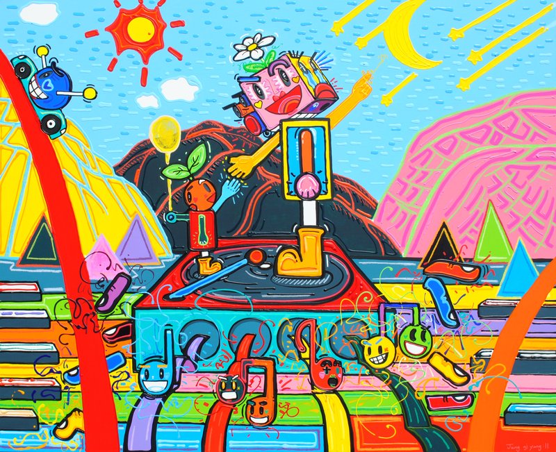 장기용 작가의 화면은 듣는 화면입니다. 그가 어떤 음악을 듣는 사람들을 묘사하였는지 집중해 보세요. 화면 가운데에는 늘 음악을 만드는, 창작하는 사람이 있습니다. 그리고 그 아래에는 음악을 듣고 즐기며 감상하고 그 느낌을 표현하는 사람들의 손이 있습니다. 제각기 다른 손 모양과 색깔은 개개인이 고유한 인격을 지닌 사람임을 암시하고 있습니다. 공연장에서 모두 같은 음악을 듣고 즐기며 타인과 함께하지만, 서로 다른 인격체임을 말하고 있습니다. 그들이 어떠한 감정을 표현하고 있는지 유심히 관찰하고 유추하면, 장기용 작가가 들었던, 그리고 감상자에게 들려주는 음악이 들리는 듯합니다. 장기용 작가의 작품을 감상하실 때는 지금 듣고 싶은 음악을 들어보며 감상해 보면 어떨까요?