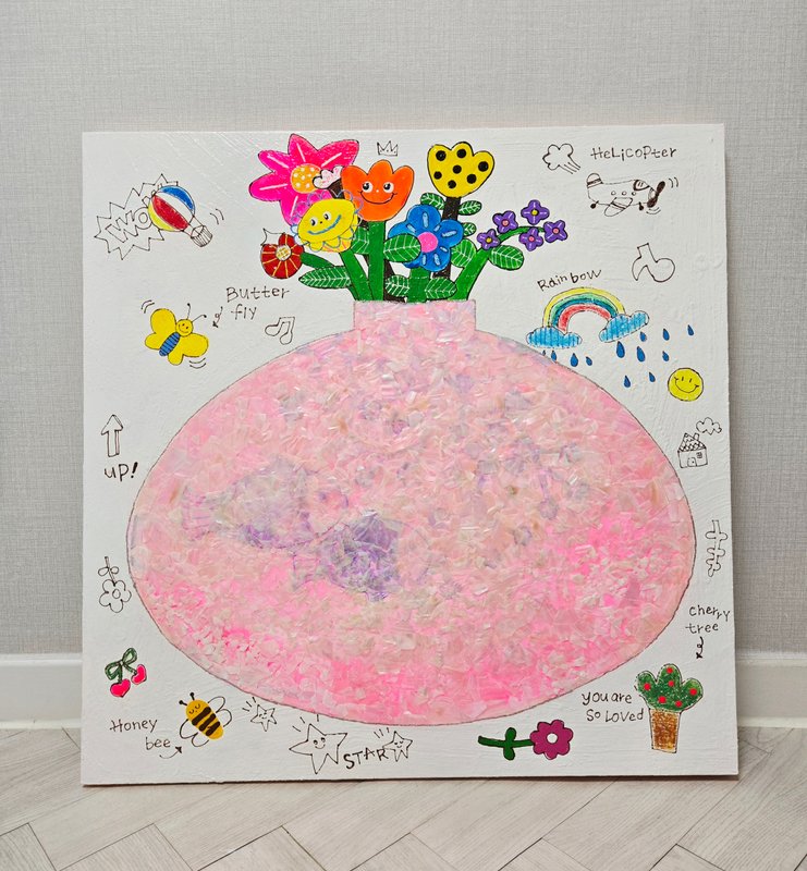 동화책을 펼친 듯, 천진난만한 동심이 가득 느껴지는 작품입니다. 작가는 유년 시절 상상의 나래를 충분히 펼치지 못함으로 인해 느끼는 갈증을 해소하고자 자신의 작업이 시작되었을 것이라고 설명한다. 화면 속에는 우리에게 익숙한 동화의 장면들과 캐릭터가 겹쳐 그려져 있다. 즉흥적으로 캔버스 위를 채워 나가는 작업 방식은 더욱 독특하고 개성 있는 상상의 세계를 만들어 낸다. 유년 시절의 감각을 되살려 그려진 작품은 아이처럼 엉뚱하지만, 그 기발함에 웃음이 지어진다. 작품 속에는 구불구불한 낙서가 관찰된다. 낙서는 정돈되지 않아 거칠지만, 특유의 순수함을 갖는다. 주된 재료인 오일파스텔의 부드러운 질감은 작품의 분위기를 포근하게 만들어준다. 마치 오래전에 그렸던 그림을 꺼내 보듯 향수와 그리움이 느껴지기도 한다.