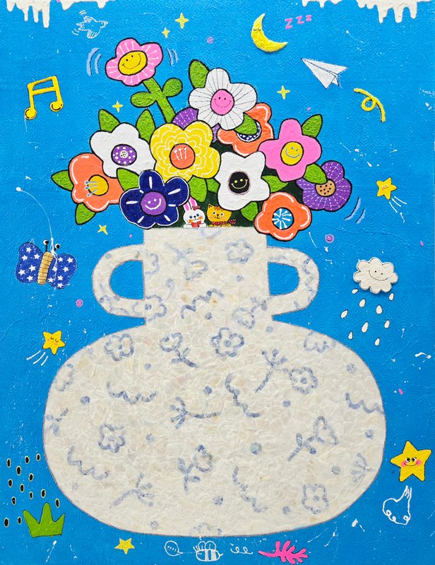 작가는 스스로를 ‘키덜트(Kidult)’ 라 칭합니다. 키덜트란 ‘Kid’와 ‘Adult’의 합성어로 아이들 같은 감성과 취향을 지난 어른을 뜻합니다. 어린아이는 그 시기에만 갖는 순수함이 있기에 더욱 특별한 존재입니다. 아이들은 사물에 대한 고정관념이 없으므로 창의적입니다. 어른들의 시선에서 아이들의 사고방식은 이해하기 어렵지만, 그래서 그 기발함에 놀라움을 느끼곤 합니다. 이 특별한 능력은 시간이 지나 어른이 되어가는 과정에서 점차 사라져 갑니다. 그런 의미에서 키덜트란 단순히 어린 애 같은 사람이 아닌, 그만큼 창의적이고 상상력이 풍부한 사람이라 생각해 볼 수 있습니다. 작품 속에 펼쳐지는 상상의 세계는 행복과 즐거움이 가득해 보이지만, 한편으론 더 이상 되돌아갈 수 없는 어린 시절을 붙잡아 두고자 하는 간절함이 느껴지기도 합니다. 아이들에게는 상상력을 자극해 주며 어른에게는 따뜻한 추억이 되어줄 작품입니다.