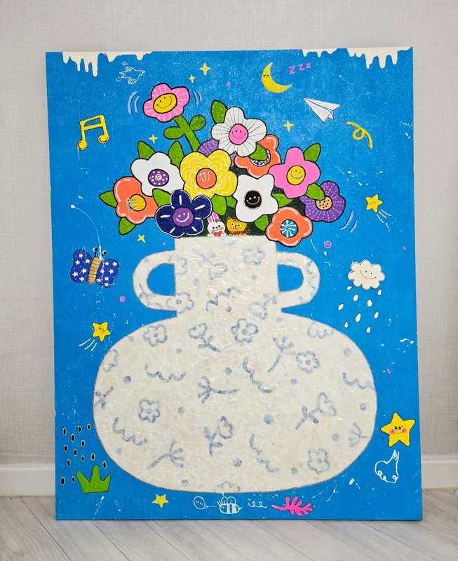 동화책을 펼친 듯, 천진난만한 동심이 가득 느껴지는 작품입니다. 작가는 유년 시절 상상의 나래를 충분히 펼치지 못함으로 인해 느끼는 갈증을 해소하고자 자신의 작업이 시작되었을 것이라고 설명한다. 화면 속에는 우리에게 익숙한 동화의 장면들과 캐릭터가 겹쳐 그려져 있다. 즉흥적으로 캔버스 위를 채워 나가는 작업 방식은 더욱 독특하고 개성 있는 상상의 세계를 만들어 낸다. 유년 시절의 감각을 되살려 그려진 작품은 아이처럼 엉뚱하지만, 그 기발함에 웃음이 지어진다. 작품 속에는 구불구불한 낙서가 관찰된다. 낙서는 정돈되지 않아 거칠지만, 특유의 순수함을 갖는다. 주된 재료인 오일파스텔의 부드러운 질감은 작품의 분위기를 포근하게 만들어준다. 마치 오래전에 그렸던 그림을 꺼내 보듯 향수와 그리움이 느껴지기도 한다.