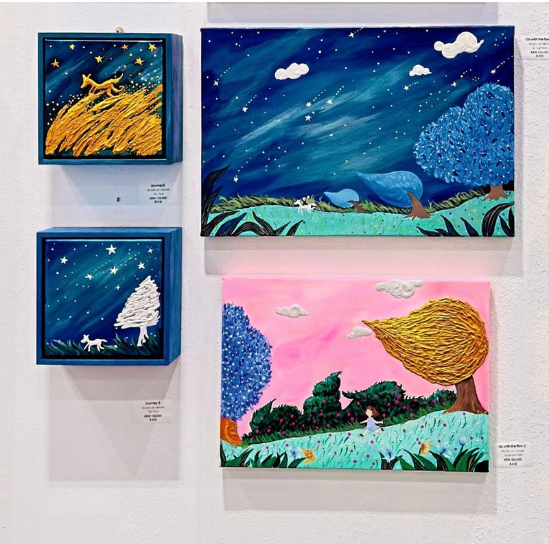 다채로운 색감이 특징인 조수빈 작가의 작품을 보면 긍정적인 희망으로 가득 차 있는 세계에 들어온 것 같은 효과를 느낄 수 있습니다. 캔버스 속 아무런 걱정 근심도 없어 보이는 대상은 아이러니하게도 현실에 대한 불안과 고민에서 벗어나고자 시작한 작가의 붓질에서 비롯되었습니다. 작가는 한때 매섭게 밀려오는 불안함에 잠시 세상과 타협해 붓을 내려놓고 평범한 직장인 생활을 택한 적이 있습니다. 각자에게 주어진 역할들을 해내며 살아가고 있다고 스스로를 위로해 보았지만, 작가의 마음에는 채워지지 않는 공허함이 존재했고, 다시 그림을 그리기 위해 붓을 잡았습니다. 그러자 그리는 행위를 통하여 수많은 걱정, 잡념 그리고 그토록 답답해하던 미래에 대한 걱정들로부터 해방되는 경험을 하였습니다. 누구나 느끼는 현재와 미래에 대한 불안은 잠시 잊고 순수했던 유년기 모습을 그린 이 작품을 감상하며 여유를 느껴보시면 어떨까요?