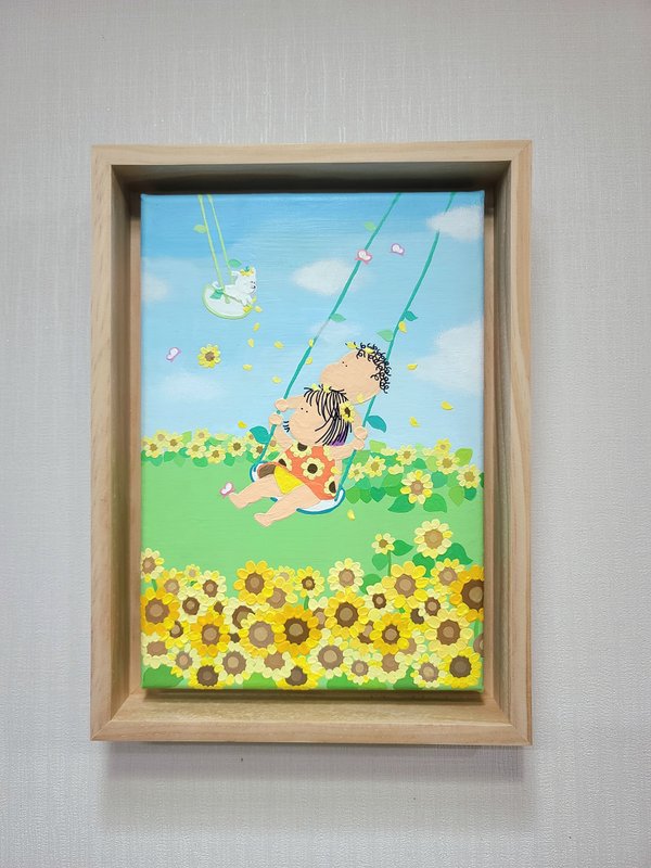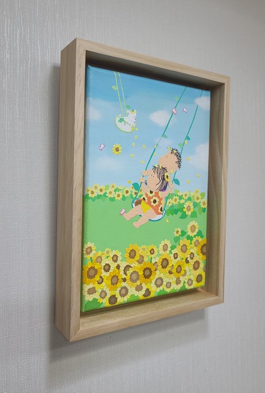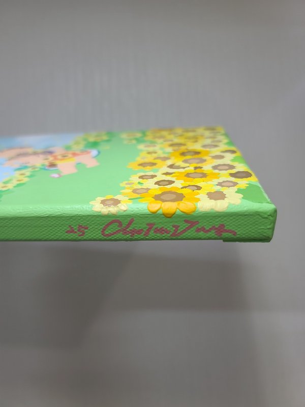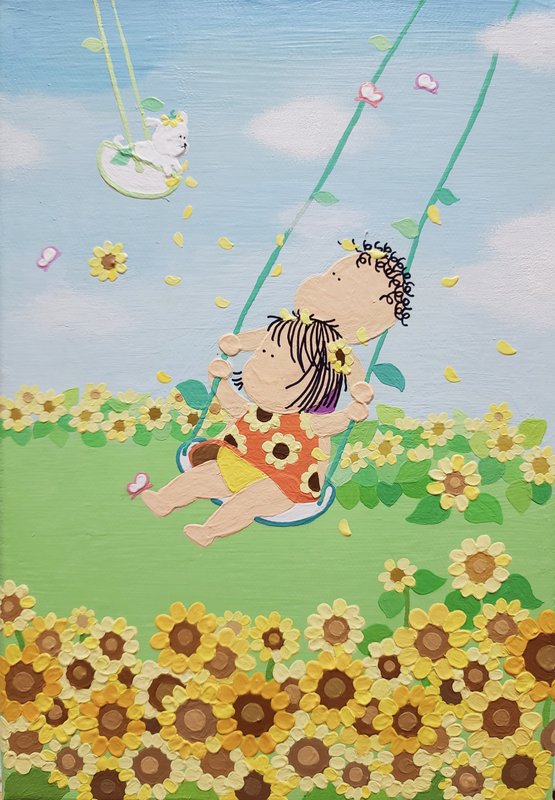 누구에게나 돌아가고 싶은 유년 시절이 존재할 것이다. 흐린 기억 속 유독 선명히 남아있는 어린 시절의 기억들은 때때로 수면 위로 떠올라 향수를 느끼게 하곤 한다. 어른이 되어가며 점점 무거워지는 삶의 무게가 버겁게 느껴질 때면 천진난만하고 근심·걱정 없던 그 시절이 더욱 그리워지곤 한다. 작가는 이러한 감정을 바탕으로 행복하게 뛰어노는 아이들의 모습을 캔버스에 담는다. ‘동심이’라는 이름을 갖는 이 캐릭터들은 유년 시절을 그리워하는 어른들의 시선과 마음을 품고 있다. 작품을 바라보면 동심이들의 행복함이 느껴져 그 안에 들어가 함께 하고 싶다는 생각이 든다. 화사하고 부드러운 파스텔 색조의 색감이 주로 사용되어 마치 봄날처럼 설레고 온화한 분위기를 갖는다. 작가는 작품을 통해 현실에 지친 이들에게 따뜻한 위로를 건네고자 한다.
