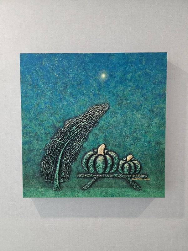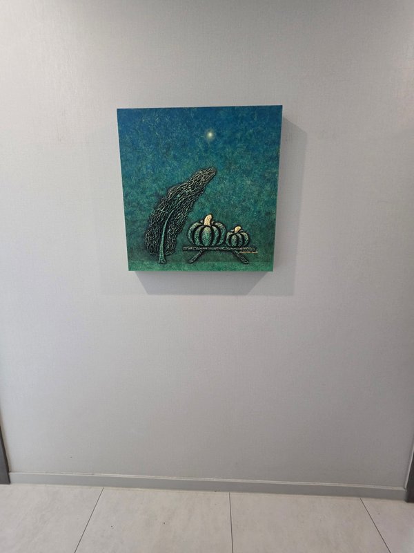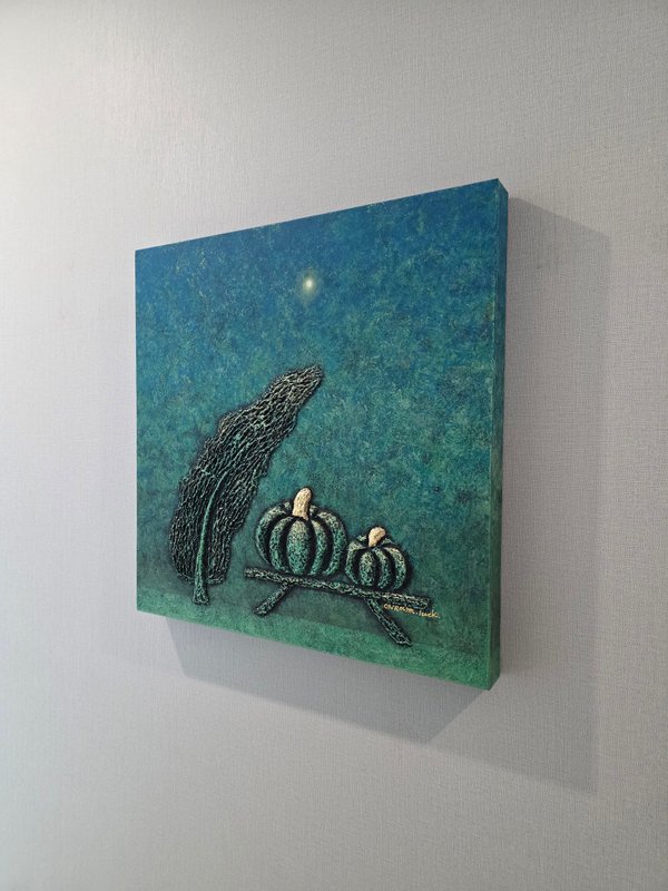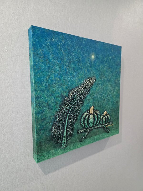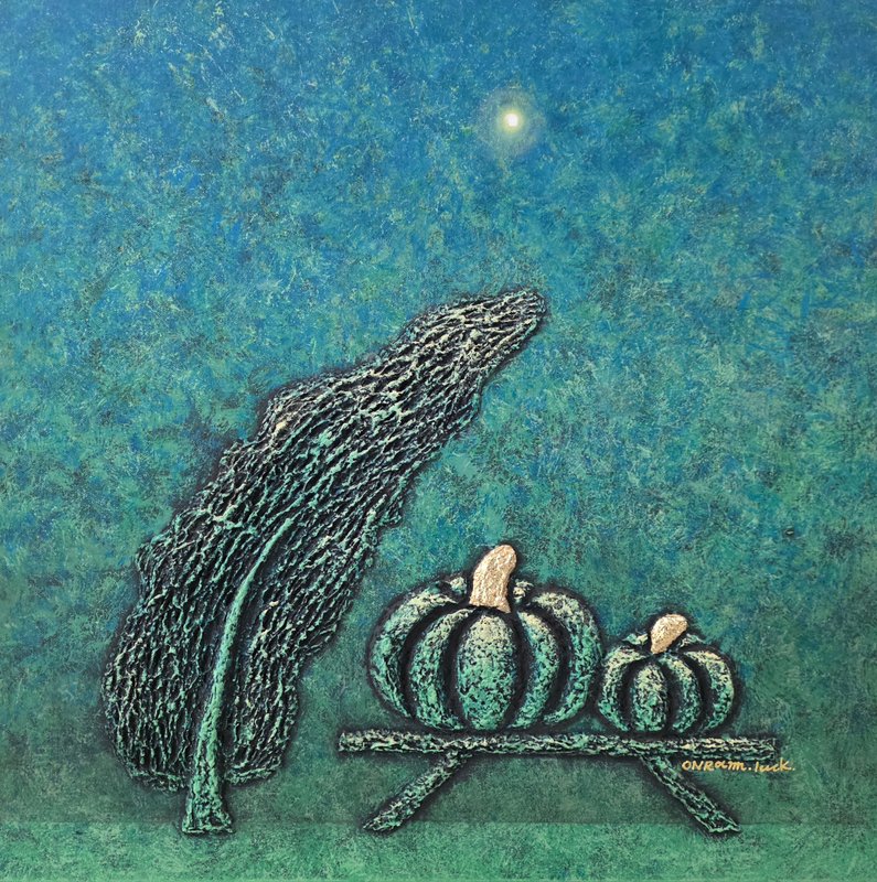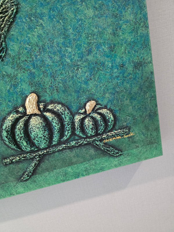 '한 줌의 복, 하나의 사랑, 그리고 하나의 호박.' 온람 작가의 '호박 시리즈'는 소박한 일상에서 출발해, 가장 깊은 내면적 의미인 '태초의 사랑'으로 이끕니다. 둥글게 품은 호박의 형상은 엄마의 자궁처럼 포근하고 안전한 공간을 상징하며, 그 안에는 가족, 연인, 삶의 시작이 담겨 있습니다. 작가는 한지와 전통 재료의 질감을 통해 감정의 결을 꾹꾹 눌러 화면에 새기고, 그 위에 스며든 색채로 순간의 감정을 포착합니다. 황금빛으로 빛나는 호박은 생명의 근원이며, 마음을 감싸는 따뜻한 안식처입니다. 빛과 별, 달의 몽환적 요소들은 그 호박을 더욱 신비롭게 감싸며, 감상자에게는 자신만의 안온한 내면 공간을 만들어갈 공간을 제공합니다. 경쟁과 피로 속에서 우리는 얼마나 자주 안식을 꿈꾸는지요. 온람 작가의 호박 하나가, 당신에게 작은 위로와 복이 되길 바랍니다.