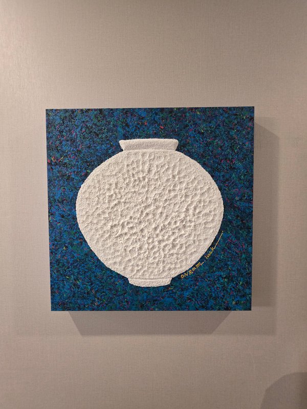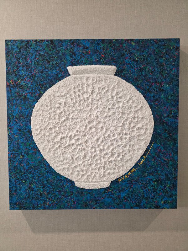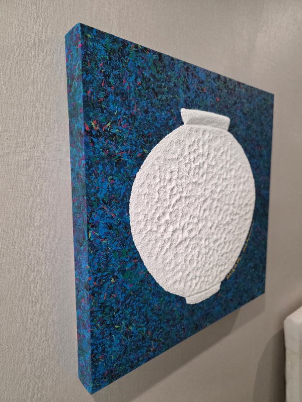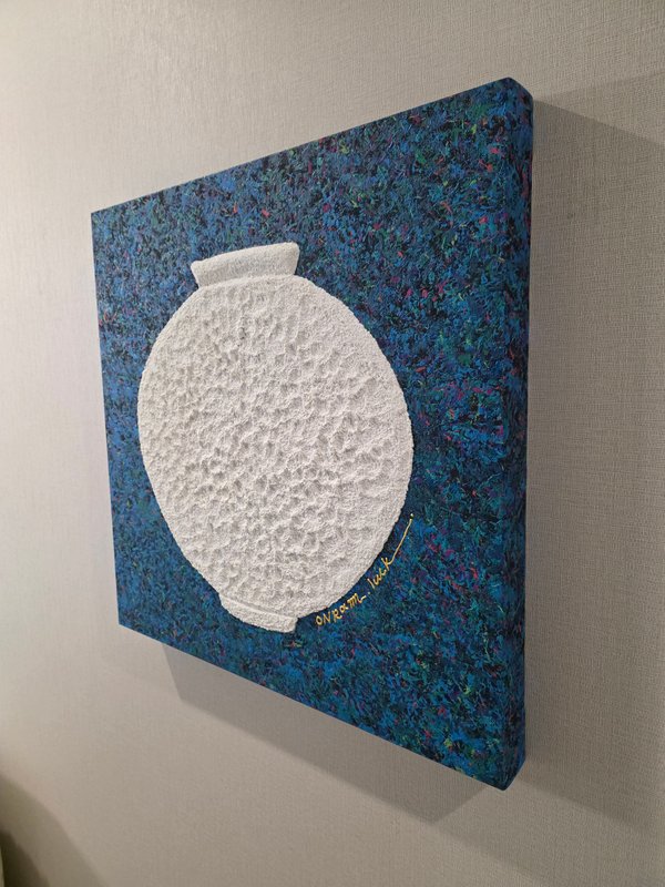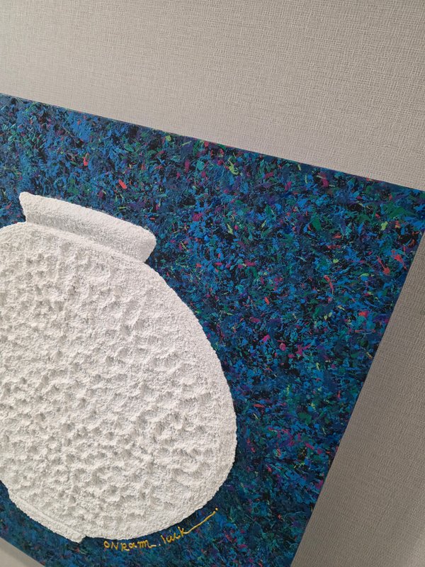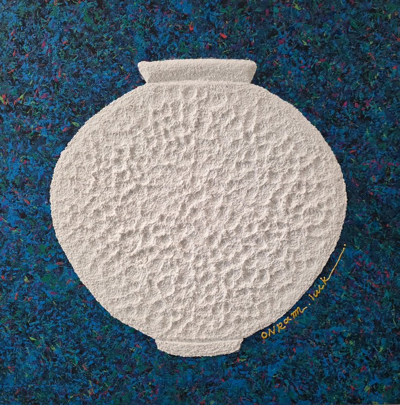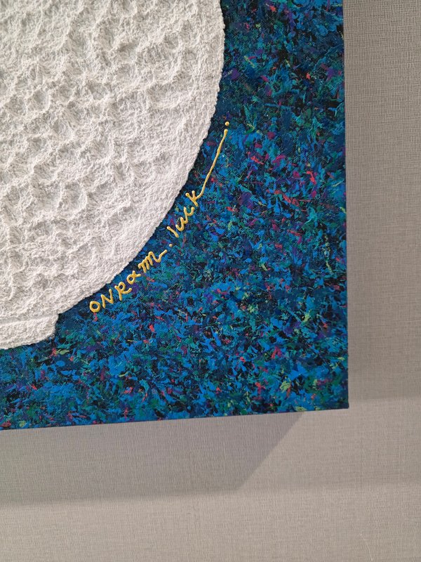 '한 줌의 복, 하나의 사랑, 그리고 하나의 호박.' 온람 작가의 '호박 시리즈'는 소박한 일상에서 출발해, 가장 깊은 내면적 의미인 '태초의 사랑'으로 이끕니다. 둥글게 품은 호박의 형상은 엄마의 자궁처럼 포근하고 안전한 공간을 상징하며, 그 안에는 가족, 연인, 삶의 시작이 담겨 있습니다. 작가는 한지와 전통 재료의 질감을 통해 감정의 결을 꾹꾹 눌러 화면에 새기고, 그 위에 스며든 색채로 순간의 감정을 포착합니다. 황금빛으로 빛나는 호박은 생명의 근원이며, 마음을 감싸는 따뜻한 안식처입니다. 빛과 별, 달의 몽환적 요소들은 그 호박을 더욱 신비롭게 감싸며, 감상자에게는 자신만의 안온한 내면 공간을 만들어갈 공간을 제공합니다. 경쟁과 피로 속에서 우리는 얼마나 자주 안식을 꿈꾸는지요. 온람 작가의 호박 하나가, 당신에게 작은 위로와 복이 되길 바랍니다.