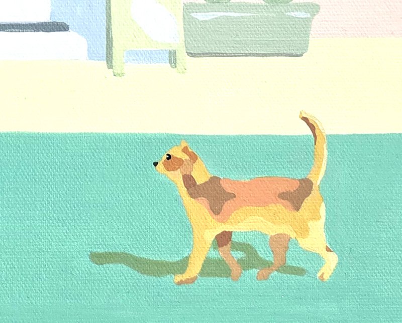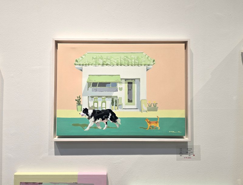 동물을 주로 그리는 희릿 작가는 신작으로 <그림자 걷기> 시리즈를 새롭게 시도하였다. 캔버스에 아크릴로 형형색색의 화려한 빌딩을 뒷배경으로 그리고, 그 앞에 각종 동물을 주인공으로 등장시키는 것이 특징이다. 작품 속 형광, 파스텔 색감의 건물 및 배경은 평소 우리가 일상에서 목격하기 힘든 풍경으로 표현되어 있어 다소 비현실적이고 이색적인 분위기를 자아낸다. 반면에 동물들은 사실적이고 현실감 있게 묘사되어 화면 속엔 낯섦과 친숙함, 현실과 상상의 세계가 공존한다. 이때 기린, 고양이, 개, 병아리 등 연관성이 작은 여러 종들이 함께 등장하곤 하는데, 작가는 차이가 존재하는 다양한 인간 군상을 각각의 동물들에 빗대고 있다. 작가에 따르면, 동물들이 걸어가며 그림자를 형성하는 '그림자 걷기'는 단순한 산책이 아니라, 각자가 자기 존재를 인식하고 내면과 마주하는 행위이다. 빛과 함께 변화하는 그림자는 우리가 자각하지 못하는 또 다른 자아를 드러내며, 희릿 작가는 결국 삶이란 그러한 그림자를 따라가며 자신을 탐색해 나가는 과정임을 작품을 통해 이야기하고 있다.