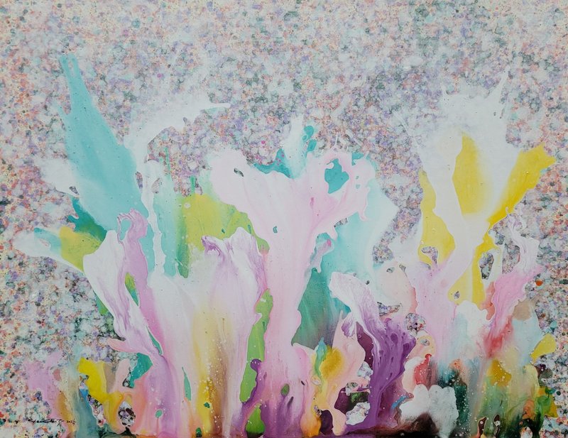 허은주 작가의 작품 이미지는 명확하다. 캔버스에 흐르고 뿌려진 여러 색의 물감들은 봄부터 여름까지의 힘찬 생명력과 에너지의 표상을 몽상적이고 아름답게 표현했다. 이리 흐르고 저리 튀며 '우연'이 모여 만들어진 작품 속 변화무쌍한 이미지는 균형을 이루고 조화롭게 보인다. 누군가에겐 보는 순간 '시작'을 위한 용기와 에너지가 되기를 바라는 작가의 이상과 낭만이기도 하다. 숨 쉬듯 잔잔하고, 한편으로는 역동적인 그녀의 작품은 어쩌면 삶을 살아가는 우리의 인생과도 닮은 것처럼 느껴진다.