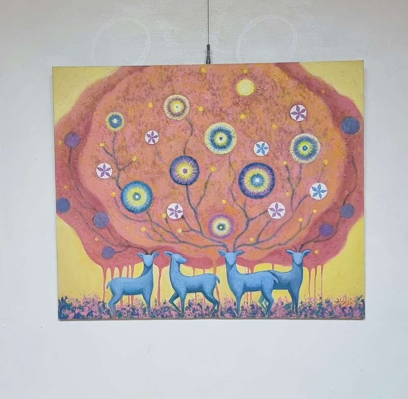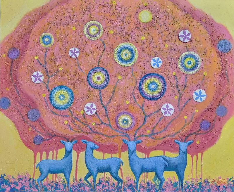 산책하다 보면 잎이 무성한 나무, 살랑이는 바람, 새의 지저귐에 문득 감동을 받게 되는 순간이 있습니다. ‘…숲은 어머니의 마음입니다. 인자하고 따뜻합니다.’라는 시의 구절처럼 자연이 주는 어머니와 같은 포용력과 요람 같은 평화로움은 잠시 힘들었던 순간을 잊게 해줍니다. 작가 또한, 숲이라는 주제로 작업하는 동안만큼은 따뜻한 시선으로 세상을 바라보며 편안한 마음으로 그 속에서 유영하는 자신을 발견합니다. 따뜻한 화면 속 물과 음악이 흐르고, 사슴이 뛰노는 모습을 바라보면 마치 꿈꾸는 듯한 시간을 가져다줍니다. 복잡한 사회에 지친 현대인들이 작품을 감상하는 동안에는 복잡한 생각이 들지 않도록 편안함을 선물하고 싶은 작가의 마음이 작품에서도 느껴집니다.