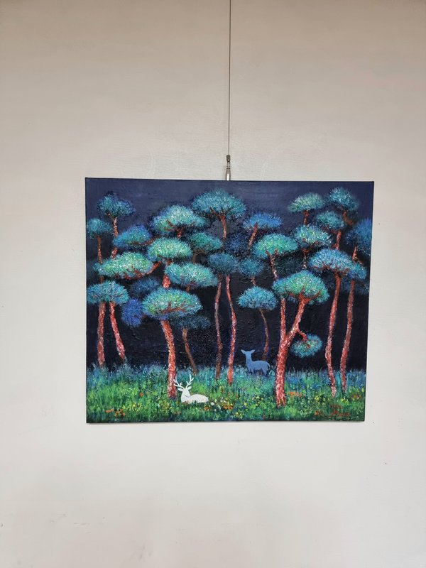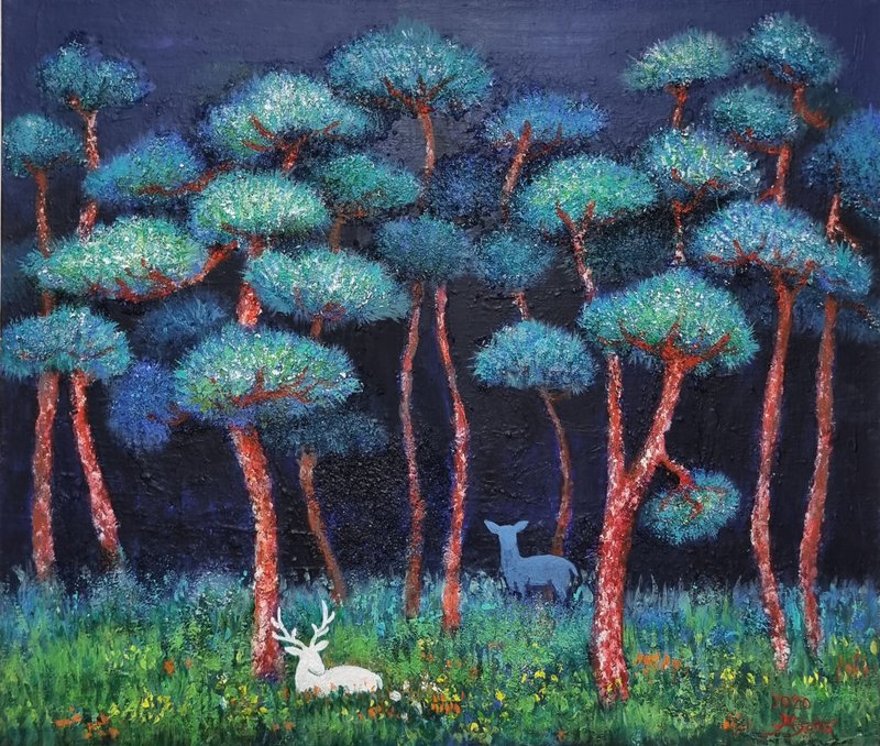 산책하다 보면 잎이 무성한 나무, 살랑이는 바람, 새의 지저귐에 문득 감동을 받게 되는 순간이 있습니다. ‘…숲은 어머니의 마음입니다. 인자하고 따뜻합니다.’라는 시의 구절처럼 자연이 주는 어머니와 같은 포용력과 요람 같은 평화로움은 잠시 힘들었던 순간을 잊게 해줍니다. 작가 또한, 숲이라는 주제로 작업하는 동안만큼은 따뜻한 시선으로 세상을 바라보며 편안한 마음으로 그 속에서 유영하는 자신을 발견합니다. 따뜻한 화면 속 물과 음악이 흐르고, 사슴이 뛰노는 모습을 바라보면 마치 꿈꾸는 듯한 시간을 가져다줍니다. 복잡한 사회에 지친 현대인들이 작품을 감상하는 동안에는 복잡한 생각이 들지 않도록 편안함을 선물하고 싶은 작가의 마음이 작품에서도 느껴집니다.