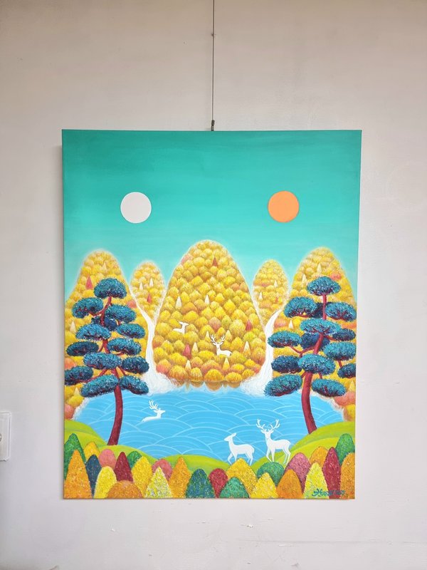 산책하다 보면 잎이 무성한 나무, 살랑이는 바람, 새의 지저귐에 문득 감동을 받게 되는 순간이 있습니다. ‘…숲은 어머니의 마음입니다. 인자하고 따뜻합니다.’라는 시의 구절처럼 자연이 주는 어머니와 같은 포용력과 요람 같은 평화로움은 잠시 힘들었던 순간을 잊게 해줍니다. 작가 또한, 숲이라는 주제로 작업하는 동안만큼은 따뜻한 시선으로 세상을 바라보며 편안한 마음으로 그 속에서 유영하는 자신을 발견합니다. 따뜻한 화면 속 물과 음악이 흐르고, 사슴이 뛰노는 모습을 바라보면 마치 꿈꾸는 듯한 시간을 가져다줍니다. 복잡한 사회에 지친 현대인들이 작품을 감상하는 동안에는 복잡한 생각이 들지 않도록 편안함을 선물하고 싶은 작가의 마음이 작품에서도 느껴집니다.