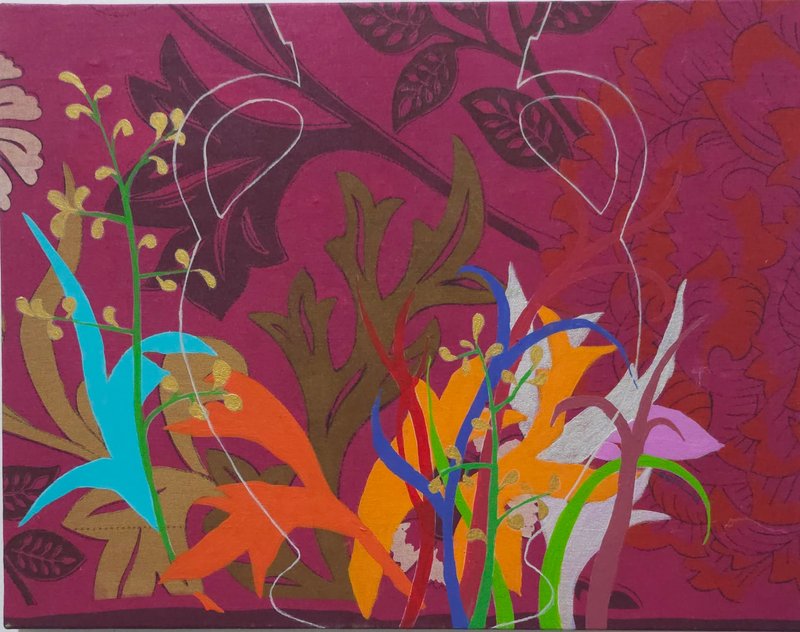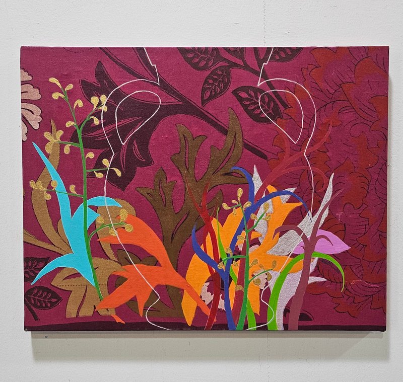 나태주 시인의 <풀꽃>이라는 시가 저절로 떠오르는 그림입니다. “자세히 보아야 예쁘다/오래 보아야 사랑스럽다/너도 그렇다”. 유심히 볼수록 매력적인 야생화의 특징을 잘 담아낸 그림이라고 생각됩니다. 언뜻 보면 그저 무성한 풀숲 같지만, 자세히 살펴보면 자신만의 아름다운 꽃을 피워 낸 야생화가 생생하게 묘사되어 있습니다. 세상엔 영화나 드라마처럼 화려한 주인공만 있는 것이 아닙니다. 각자의 삶을 살아가고 있는 사람이라면 누구나 ‘나’의 세상에서는 주인공이 됩니다. 가끔은 내가 너무나 초라하게 느껴질 수도 있지만, 그럴 땐 혼란한 수풀 속에서 스스로 꽃을 피워 내는 야생화를 떠올려 봅시다. 이 빛나는 작은 꽃처럼 우리의 삶이 빛나길 바라는 마음을 담아 작업하는 정세미 작가의 작품을 바라보는 것만으로도 작은 위로가 될 것입니다. 작가의 그림 속 거대한 수풀 사이에서 작지만 꼿꼿하게 자리를 지키는 야생화를 유심히 관찰하세요.