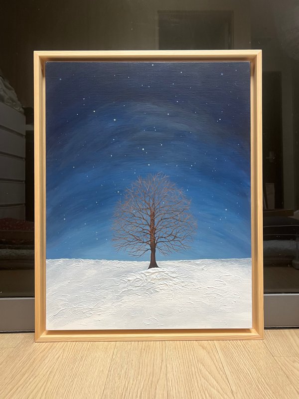 여러분은 무엇으로 삶을 기록하시나요? 란작가는 일상의 순간을 자신만의 방식으로 캔버스 위에 기록합니다. 이번 작품은 여행의 순간을 그림 그린 것입니다. 이러한 기록의 행위는 작가에게 따뜻한 위안을 주는데요, 작가는 그림을 그림으로써 지난 감정들에 대한 성찰의 시간을 가지게 되고, 이 과정이 참 행복하다고 느끼기 때문입니다. 이어, 작가는 작업의 현장에서 느낀 행복을 대중들과 나누고 싶어 합니다. 그런 따뜻한 시선이 담겨서인지 눈밭으로 뒤덮인 땅과 그 위에 가냘픈 몸의 나무가 마냥 차갑거나 외로워 보이지 않는 것 같습니다. 작품을 보고 있으면 마치 작가와 같이 여행을 다녀온 후에 그 순간을 추억하는 기분마저 듭니다. 반복되는 삶에 지쳤다면, 잠시 새하얀 풍경을 마주하며 지난날의 순간을 회상하거나 다녀온 여행 이야기를 대화로, 그림으로 혹은 글로 기록하는 시간을 가져보는 건 어떠신가요?
