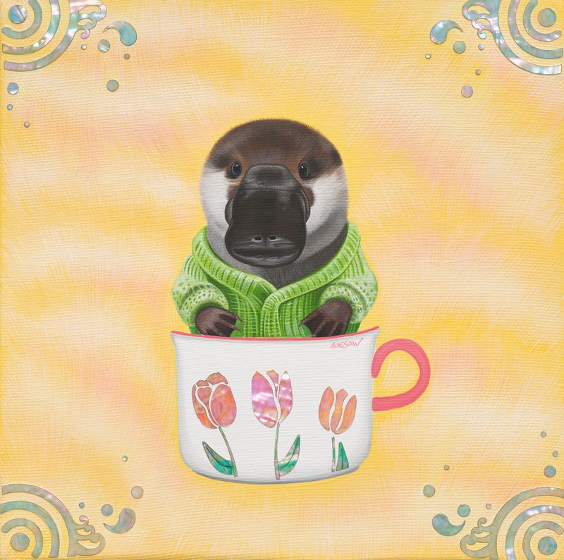 시소 작가는 찻잔에 토끼, 병아리, 그리고 오리와 같이 우리 주변을 채우는 존재를 담습니다. 이처럼 작가는 찻잔 안에 다양한 이미지를 담음으로 소중한 이웃을 상기시킵니다. 이는 찻잔 속 존재 곧 자연에 대한 생각과 관심, 그리고 존중을 요구하는 정중한 부탁이라고도 할 수 있을 것 같습니다. 부드러운 색채와 결이 살아있는 세밀한 붓 터치로 감상자에게 심미적 아름다움을 주는 동시에 자연에 대한 존중과 사랑을 전달하는 작품으로, 여러분의 공간을 아름답게 채워보는 것은 어떠실까요?