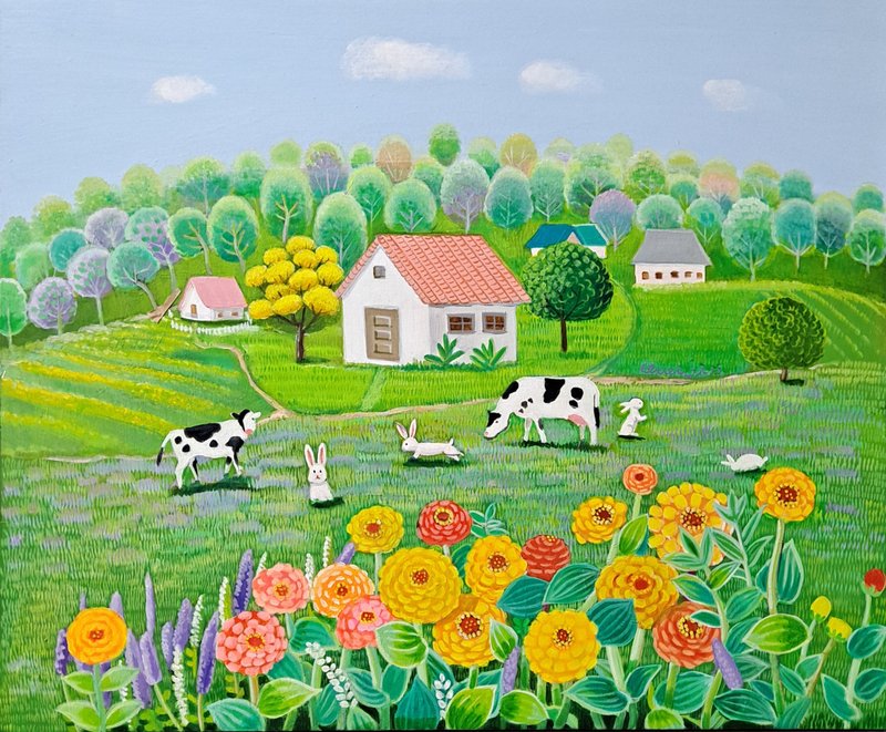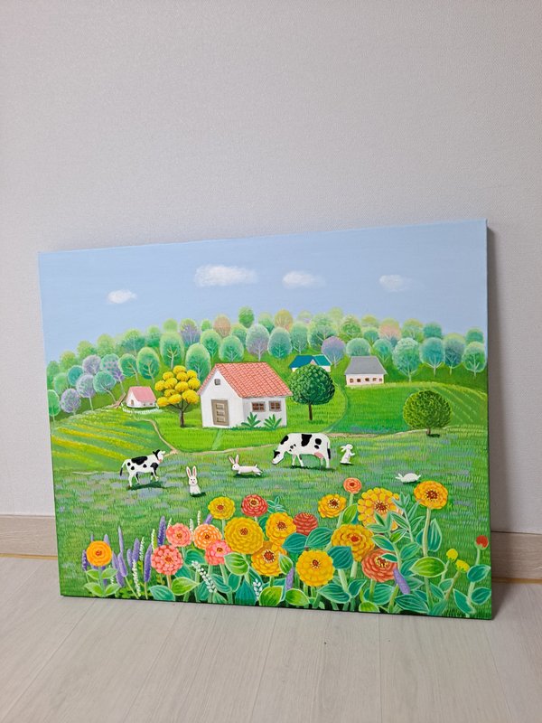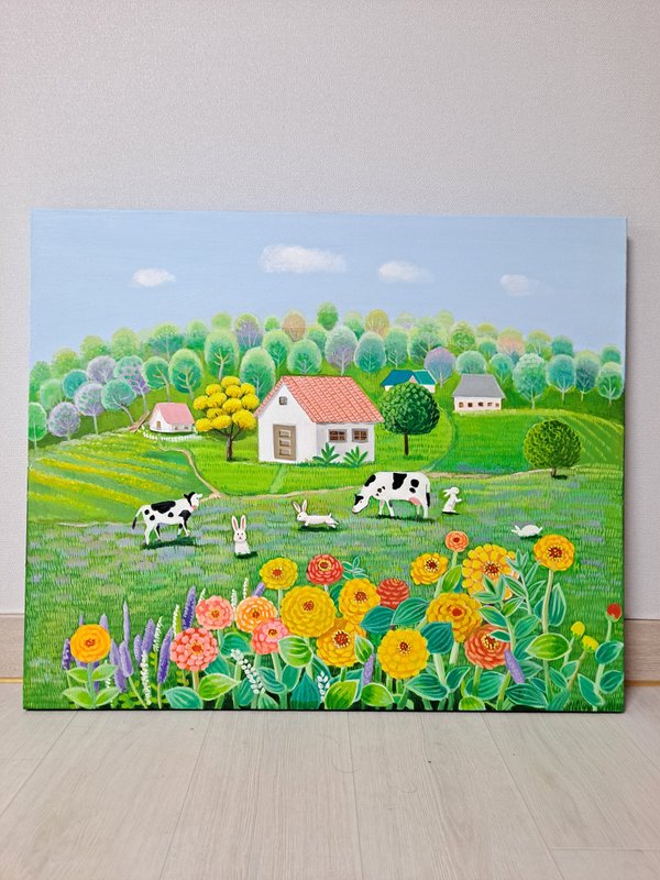 최진 작가는 만개한 꽃의 정원 속 인간과 동물들이 함께하는 유토피아를 꿈꾸며, 동화처럼 아름다운 세상을 작품으로 그려냅니다. 인간과 동물의 생활 반경이 명확히 구분되어 있는 현실과 달리, 화폭 속 알록달록한 색상의 정원에는 모든 생명체가 자연스럽게 어우러져 있습니다. 그는 바쁜 나날 속 회색빛 콘크리트 도시처럼 색 바랜 현대인의 내면을 푸른 들판에 피어난 꽃송이처럼, 다채로운 색으로 가득 채우고자 했습니다. '휴일', '파라다이스', '행복' 등 작품의 제목에 사용된 단어에서 엿볼 수 있듯, 최진 작가의 캔버스는 동산 위를 뛰어노는 어린아이의 순수한 마음처럼, 즐거움으로 만개해 있습니다. 입가에 은은한 미소를 선사하는 그의 작품을 통해, 오늘의 나에게 작은 휴식을 선물해 보세요.