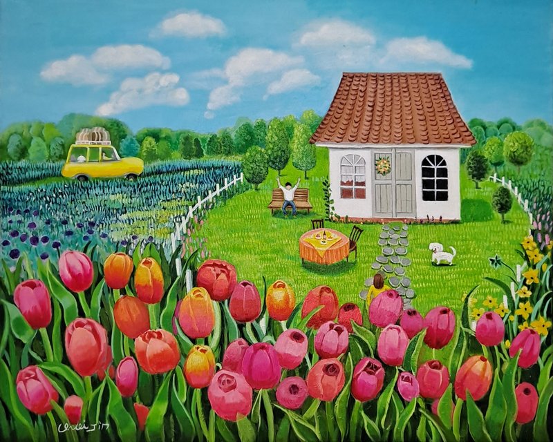 최진 작가는 만개한 꽃의 정원 속 인간과 동물들이 함께하는 유토피아를 꿈꾸며, 동화처럼 아름다운 세상을 작품으로 그려냅니다. 인간과 동물의 생활 반경이 명확히 구분되어 있는 현실과 달리, 화폭 속 알록달록한 색상의 정원에는 모든 생명체가 자연스럽게 어우러져 있습니다. 그는 바쁜 나날 속 회색빛 콘크리트 도시처럼 색 바랜 현대인의 내면을 푸른 들판에 피어난 꽃송이처럼, 다채로운 색으로 가득 채우고자 했습니다. '휴일', '파라다이스', '행복' 등 작품의 제목에 사용된 단어에서 엿볼 수 있듯, 최진 작가의 캔버스는 동산 위를 뛰어노는 어린아이의 순수한 마음처럼, 즐거움으로 만개해 있습니다. 입가에 은은한 미소를 선사하는 그의 작품을 통해, 오늘의 나에게 작은 휴식을 선물해 보세요.