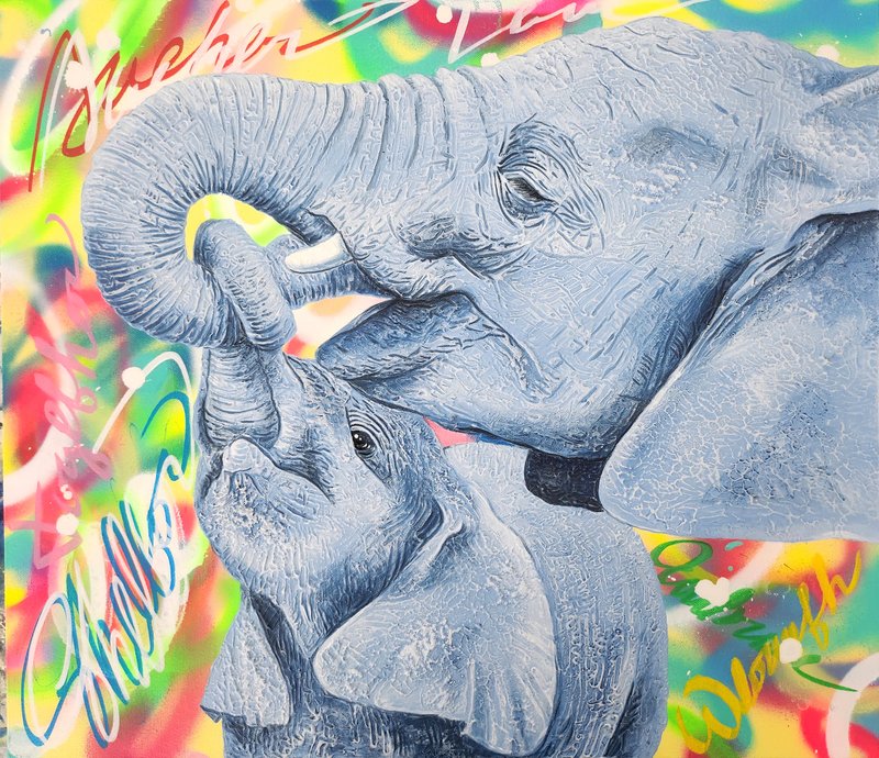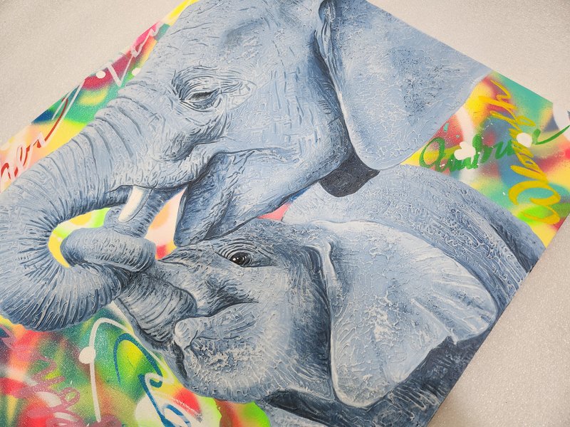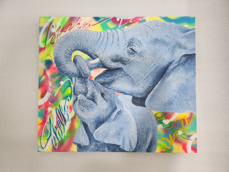 김서연 작가는 코끼리로 꿈과 도전을 그립니다. 작가가 특별히 사용하는 기법은 '플루이드'인데요, 플루이드란 유동적인 성질을 가진 재료가 흐르는 방향이나 모양에 따라 그림이 완성되는 기법으로, 우연적 효과로 그려진다는 점이 매력적입니다. 코끼리 사회는 모계사회로, 암컷 수장 코끼리의 지혜와 따뜻함을 닮고 싶었던 작가는 코끼리 이미지에 자기 자신을 투영하고자 했고, 플로이드의 '자유로움'과 '도전적 특성'이 작가가 그리고자 하는 코끼리를 가장 잘 표현할 수 있는 적합한 기법이라고 생각했습니다. 작가는 다채로운 색채로 코끼리에 생동감을 부여하는데요, 그림을 보다 보면 코끼리가 온화한 에너지로 교감을 나누고자 하는 듯한 느낌이 듭니다. 오아시스를 찾아 나미브 사막을 걷는 코끼리처럼 작가는 그리는 행위로 꿈을 잃지 않고 예술인 동지와 함께하는 길에 대한 열정을 표출하며, 행복을 충만하게 누릴 것을 다짐합니다. 김서연 작가의 강인한 부드러움이 느껴지는 코끼리의 응원으로 마음속에 품고 있던 꿈과 도전을 꺼내보며 별빛 가득한 하루를 보내시는 건 어떠신가요?