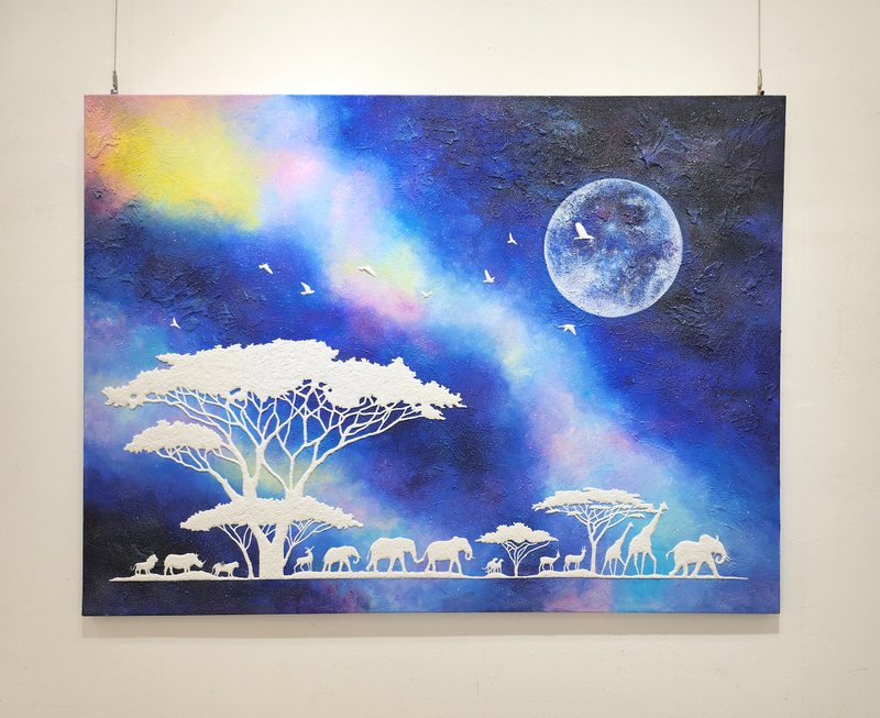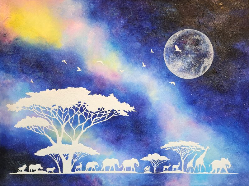 김서연 작가는 코끼리로 꿈과 도전을 그립니다. 작가가 특별히 사용하는 기법은 '플루이드'인데요, 플루이드란 유동적인 성질을 가진 재료가 흐르는 방향이나 모양에 따라 그림이 완성되는 기법으로, 우연적 효과로 그려진다는 점이 매력적입니다. 코끼리 사회는 모계사회로, 암컷 수장 코끼리의 지혜와 따뜻함을 닮고 싶었던 작가는 코끼리 이미지에 자기 자신을 투영하고자 했고, 플로이드의 '자유로움'과 '도전적 특성'이 작가가 그리고자 하는 코끼리를 가장 잘 표현할 수 있는 적합한 기법이라고 생각했습니다. 작가는 다채로운 색채로 코끼리에 생동감을 부여하는데요, 그림을 보다 보면 코끼리가 온화한 에너지로 교감을 나누고자 하는 듯한 느낌이 듭니다. 오아시스를 찾아 나미브 사막을 걷는 코끼리처럼 작가는 그리는 행위로 꿈을 잃지 않고 예술인 동지와 함께하는 길에 대한 열정을 표출하며, 행복을 충만하게 누릴 것을 다짐합니다. 김서연 작가의 강인한 부드러움이 느껴지는 코끼리의 응원으로 마음속에 품고 있던 꿈과 도전을 꺼내보며 별빛 가득한 하루를 보내시는 건 어떠신가요?