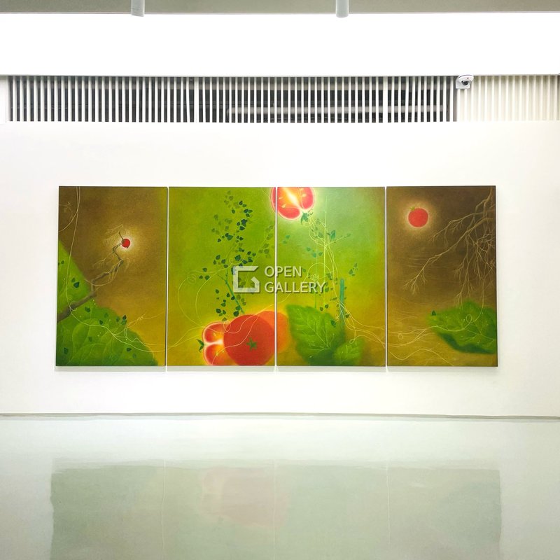 문은지 작가는 방울토마토라는 일상적인 소재를 통해 생명의 본질과 그 이면에 숨겨진 역동성을 탐구한다. 작가는 주목받지 못하는 뿌리와 이름 없는 잎을 조명하며, 식물의 생명력과 그 안에서 이루어지는 미묘한 연결을 시각적으로 표현한다. 선과 점을 활용한 율동감 있는 표현은 방울토마토의 성장 과정에서 나타나는 유기적 관계와 조화를 담아내며, 자연의 섬세한 질서를 드러낸다. 또한 작가는 유기적 관계의 상호작용을 표현하기 위해, 뿌리기 등의 다양한 기법을 활용하여 작품에 생기와 향을 더해낸다. 작가의 작품은 자연 속에서 쉽게 간과할 수 있는 생명의 흐름과 그 깊이를 새롭게 조명하며, 작가가 추구하는 생명에 대한 깊이 있는 사유를 보여준다.