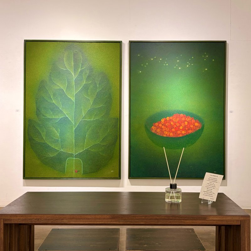 문은지 작가는 방울토마토라는 일상적인 소재를 통해 생명의 본질과 그 이면에 숨겨진 역동성을 탐구한다. 작가는 주목받지 못하는 뿌리와 이름 없는 잎을 조명하며, 식물의 생명력과 그 안에서 이루어지는 미묘한 연결을 시각적으로 표현한다. 선과 점을 활용한 율동감 있는 표현은 방울토마토의 성장 과정에서 나타나는 유기적 관계와 조화를 담아내며, 자연의 섬세한 질서를 드러낸다. 또한 작가는 유기적 관계의 상호작용을 표현하기 위해, 뿌리기 등의 다양한 기법을 활용하여 작품에 생기와 향을 더해낸다. 작가의 작품은 자연 속에서 쉽게 간과할 수 있는 생명의 흐름과 그 깊이를 새롭게 조명하며, 작가가 추구하는 생명에 대한 깊이 있는 사유를 보여준다.