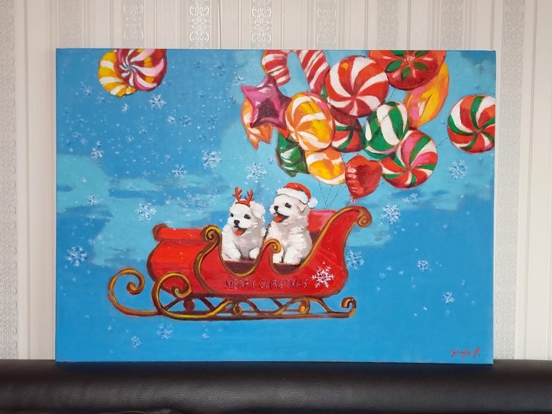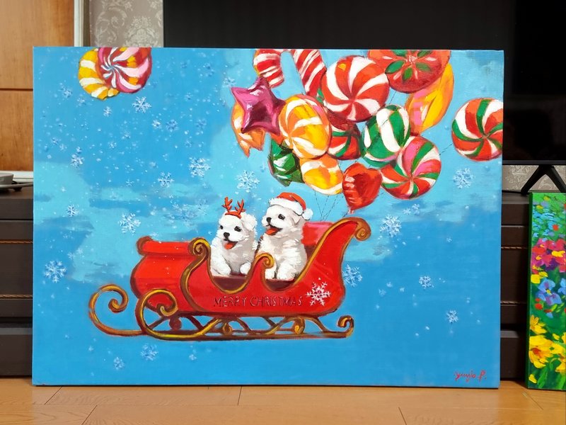 정말로 ‘행복한 마음의 정원’이 존재한다면, 그곳에는 활짝 핀 꽃들과 해맑게 웃는 강아지들이 함께할 것입니다. 박윤조 작가는 그 정원을 화폭 위에 구현하며, 우리가 그 풍경에 들어갈 수 있게 합니다. 작품 속 강아지들은 꽃을 입에 물고 산책하거나, 풍선에 매달려 하늘을 나는 등 현실과 환상의 경계를 넘나드는 연출을 구성합니다. 전통 유화 기법을 바탕으로 한 생생하고 화려한 색채와 빛의 조화는 보는 이의 감각을 깨우고, 온기를 전하는데요, 작가는 선명한 색상의 배경과 대비되는 흰색 강아지를 중심에 두어, 기쁨과 감정을 강조합니다. 이 정원은 서로를 바라보고 기대며 살아가는 우리 삶의 방식에 대한 은유입니다. 꽃과 강아지라는 상징을 통해 작가는 사랑, 위로, 동행이라는 관계의 미학을 표현하고, 평화롭고 다정한 순간들을 불러일으키며, 함께 있는 존재가 주는 온기와 따뜻한 관계들로 만들어지는 삶의 방식을 제시합니다.