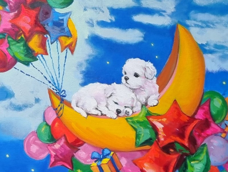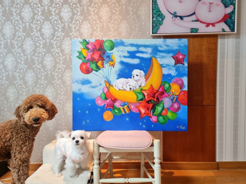 정말로 ‘행복한 마음의 정원’이 존재한다면, 그곳에는 활짝 핀 꽃들과 해맑게 웃는 강아지들이 함께할 것입니다. 박윤조 작가는 그 정원을 화폭 위에 구현하며, 우리가 그 풍경에 들어갈 수 있게 합니다. 작품 속 강아지들은 꽃을 입에 물고 산책하거나, 풍선에 매달려 하늘을 나는 등 현실과 환상의 경계를 넘나드는 연출을 구성합니다. 전통 유화 기법을 바탕으로 한 생생하고 화려한 색채와 빛의 조화는 보는 이의 감각을 깨우고, 온기를 전하는데요, 작가는 선명한 색상의 배경과 대비되는 흰색 강아지를 중심에 두어, 기쁨과 감정을 강조합니다. 이 정원은 서로를 바라보고 기대며 살아가는 우리 삶의 방식에 대한 은유입니다. 꽃과 강아지라는 상징을 통해 작가는 사랑, 위로, 동행이라는 관계의 미학을 표현하고, 평화롭고 다정한 순간들을 불러일으키며, 함께 있는 존재가 주는 온기와 따뜻한 관계들로 만들어지는 삶의 방식을 제시합니다.
