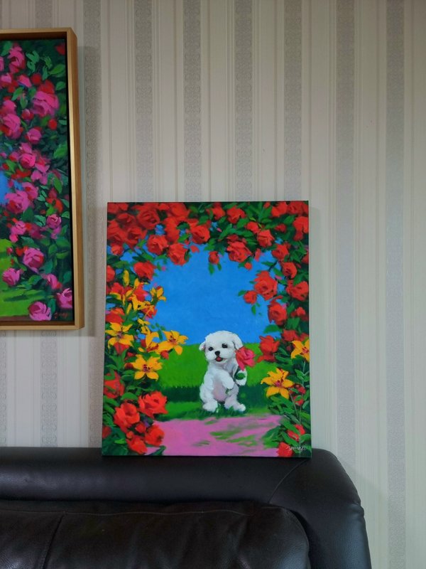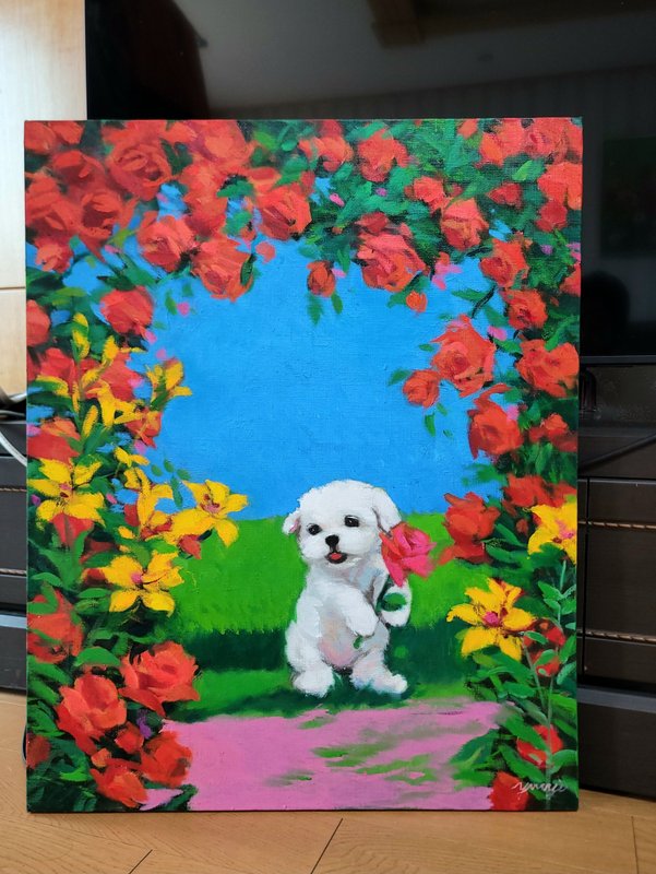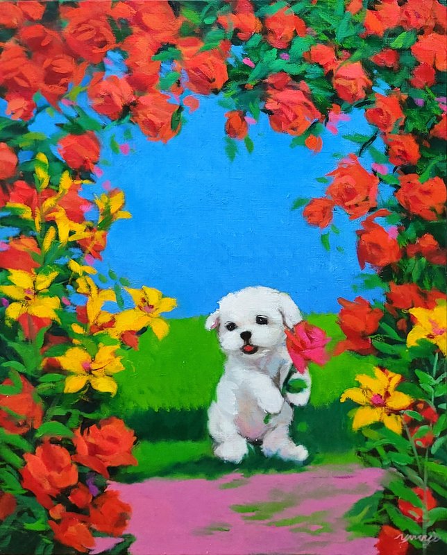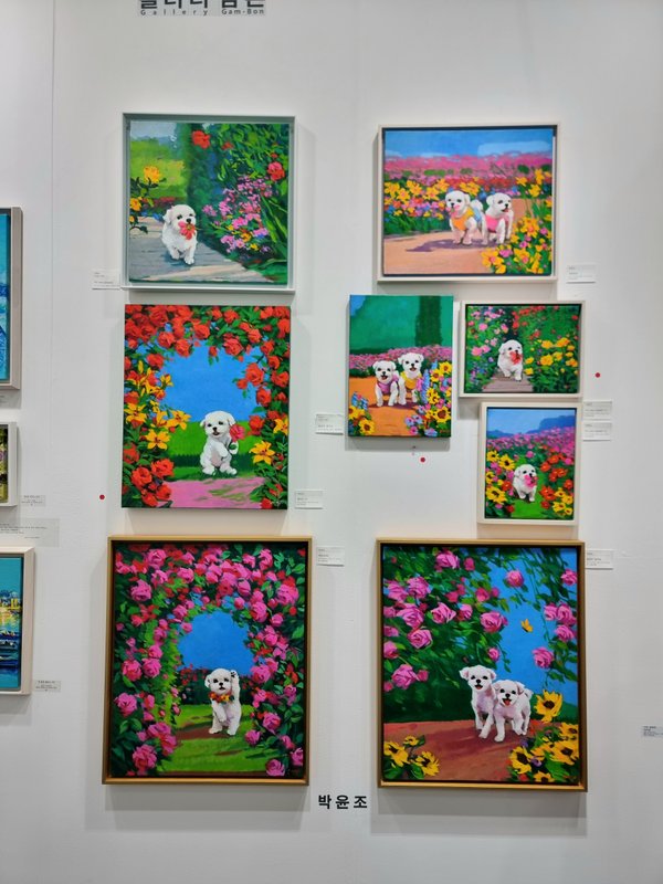 정말로 ‘행복한 마음의 정원’이 존재한다면, 그곳에는 활짝 핀 꽃들과 해맑게 웃는 강아지들이 함께할 것입니다. 박윤조 작가는 그 정원을 화폭 위에 구현하며, 우리가 그 풍경에 들어갈 수 있게 합니다. 작품 속 강아지들은 꽃을 입에 물고 산책하거나, 풍선에 매달려 하늘을 나는 등 현실과 환상의 경계를 넘나드는 연출을 구성합니다. 전통 유화 기법을 바탕으로 한 생생하고 화려한 색채와 빛의 조화는 보는 이의 감각을 깨우고, 온기를 전하는데요, 작가는 선명한 색상의 배경과 대비되는 흰색 강아지를 중심에 두어, 기쁨과 감정을 강조합니다. 이 정원은 서로를 바라보고 기대며 살아가는 우리 삶의 방식에 대한 은유입니다. 꽃과 강아지라는 상징을 통해 작가는 사랑, 위로, 동행이라는 관계의 미학을 표현하고, 평화롭고 다정한 순간들을 불러일으키며, 함께 있는 존재가 주는 온기와 따뜻한 관계들로 만들어지는 삶의 방식을 제시합니다.